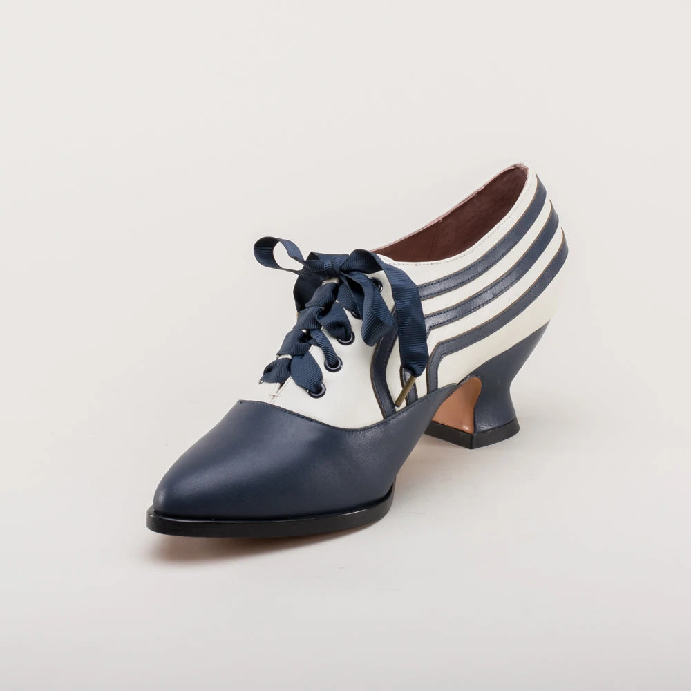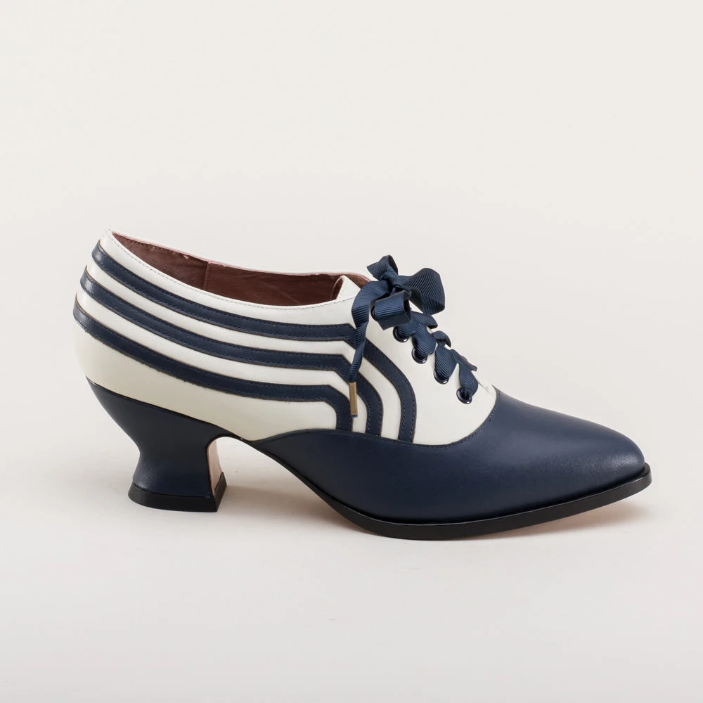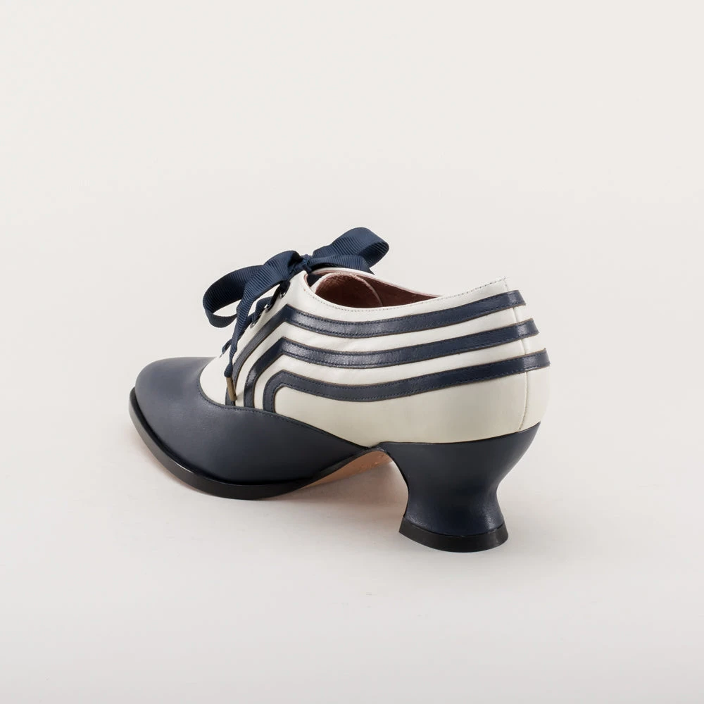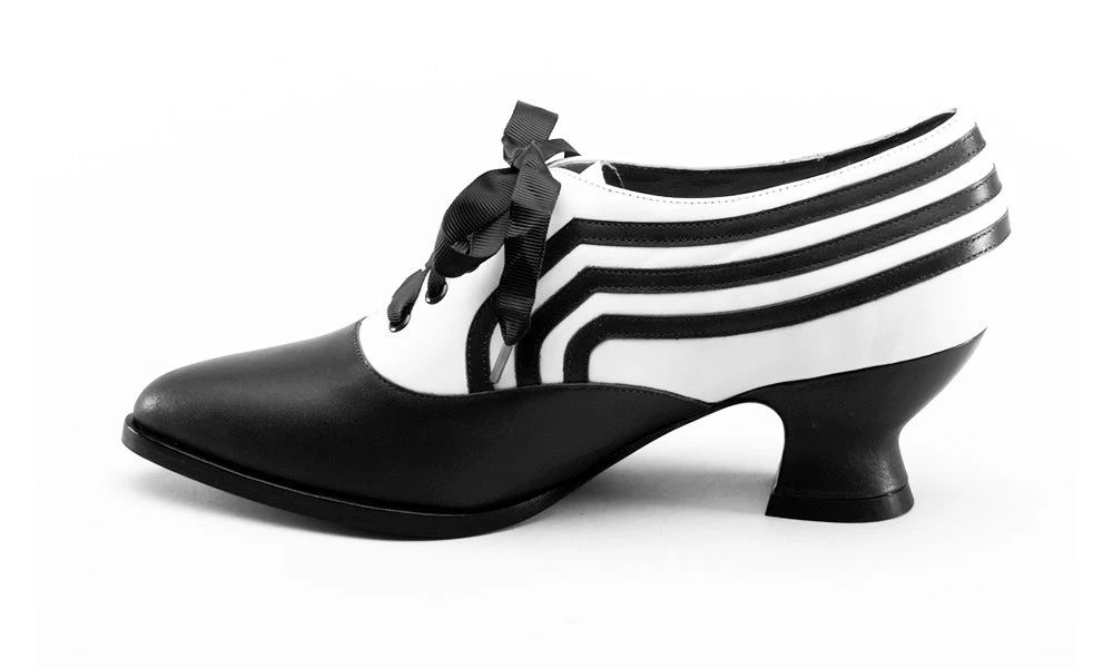 These attractive lace-up shoes have all the style and sass of footwear from c. 1900 through the 1920s and will keep you on your feet and comfortable all day, whether you’re attending historical costuming events or walking the streets of New York City. Bernadettes feature our sturdy 2 inch / 5 cm French heel, welted hard-wearing leather soles, pointed toes, and an adjustable lace-up closure, plus all that style with eye-catching contrast stripes on all-leather uppers. Delicious!