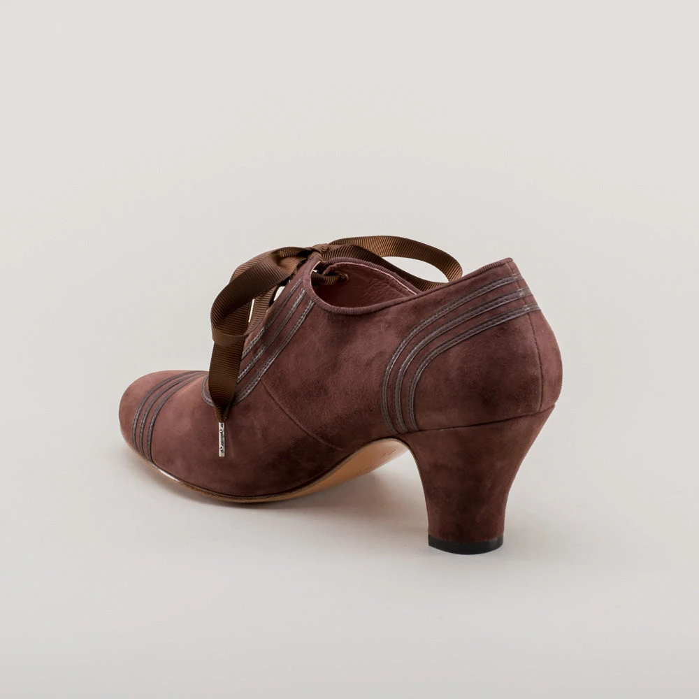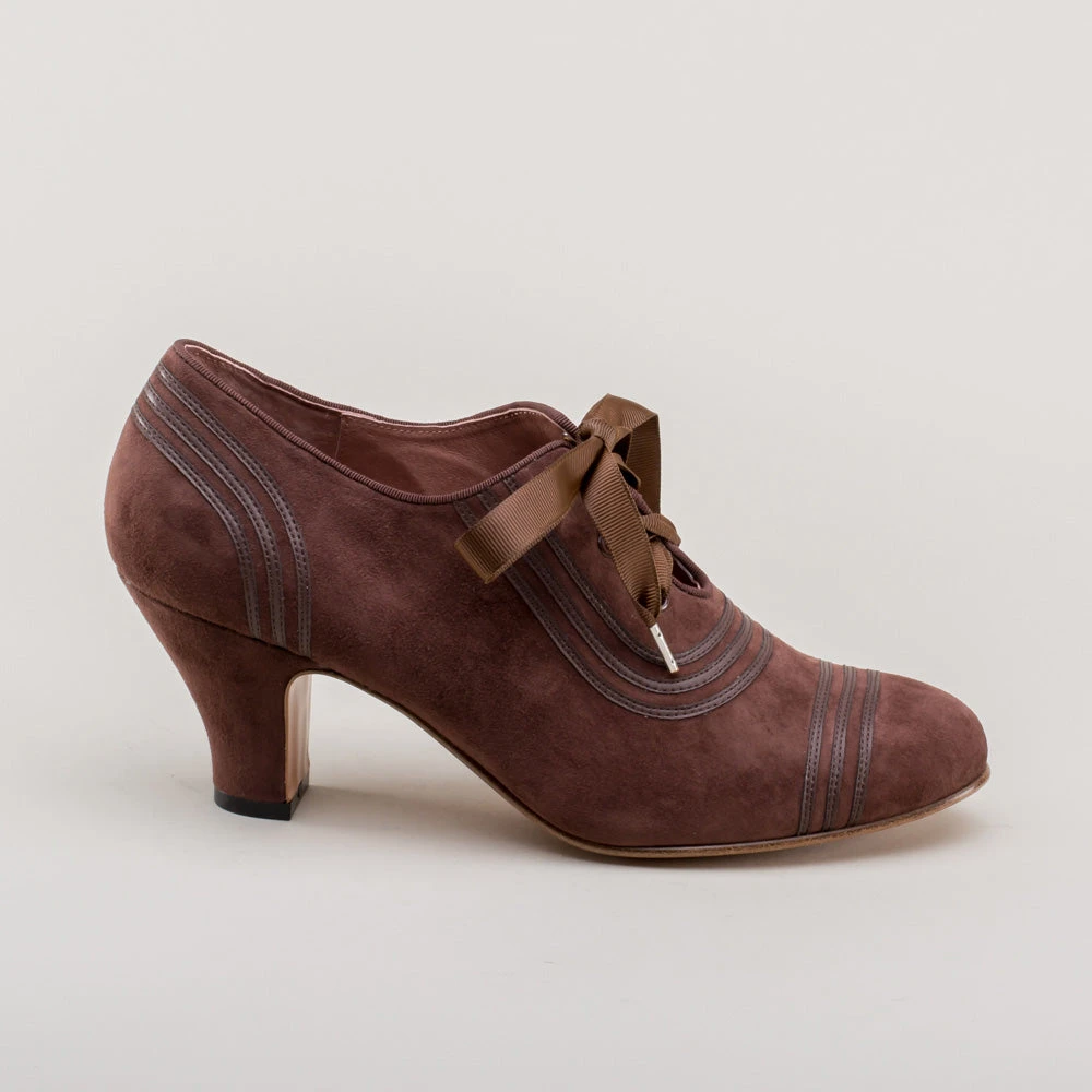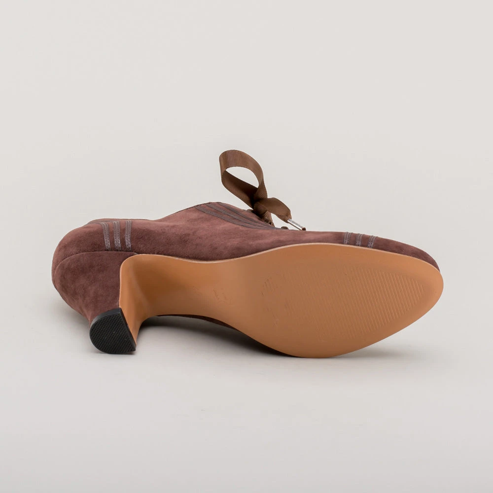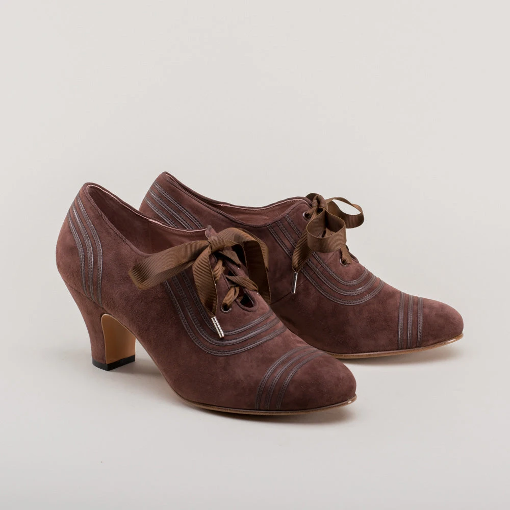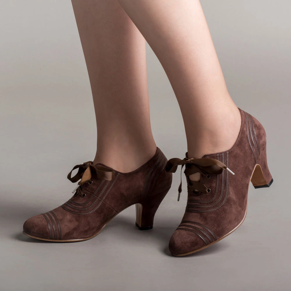 Claremont is made in soft and durable suede, trimmed with matching smooth leather, and tied with grosgrain ribbon bows. These oxfords feature a round ’30s toe and our revised, well-balanced 2.5 inch / 6.3 cm Spanish heel. Wear Claremonts with any Art Deco period attire from c. 1925 all the way through the 1940s.