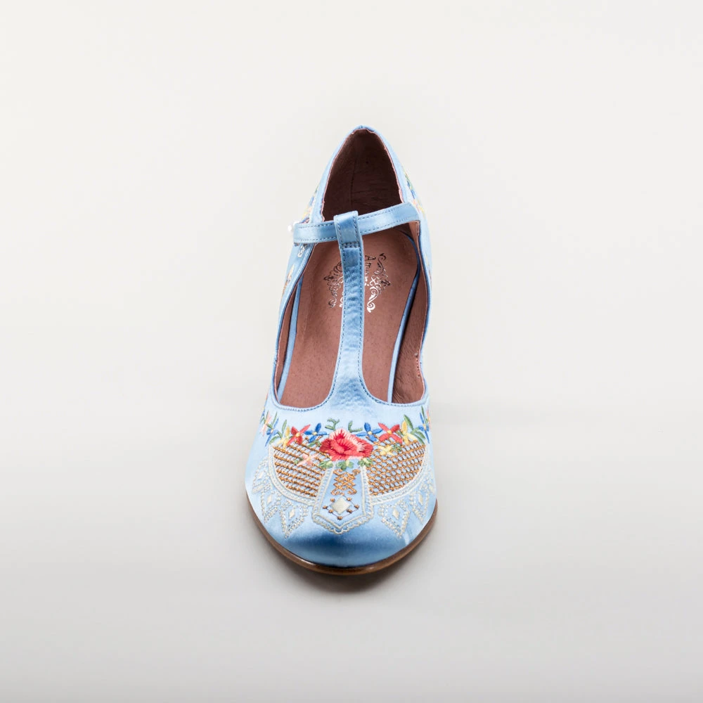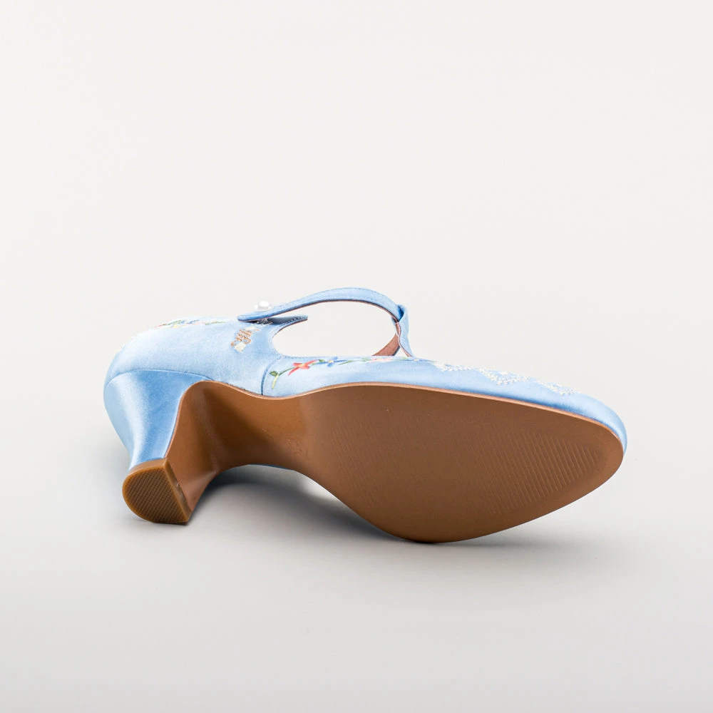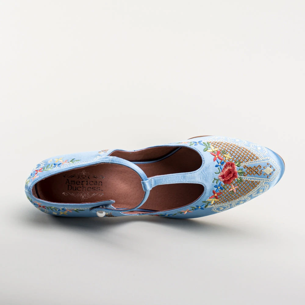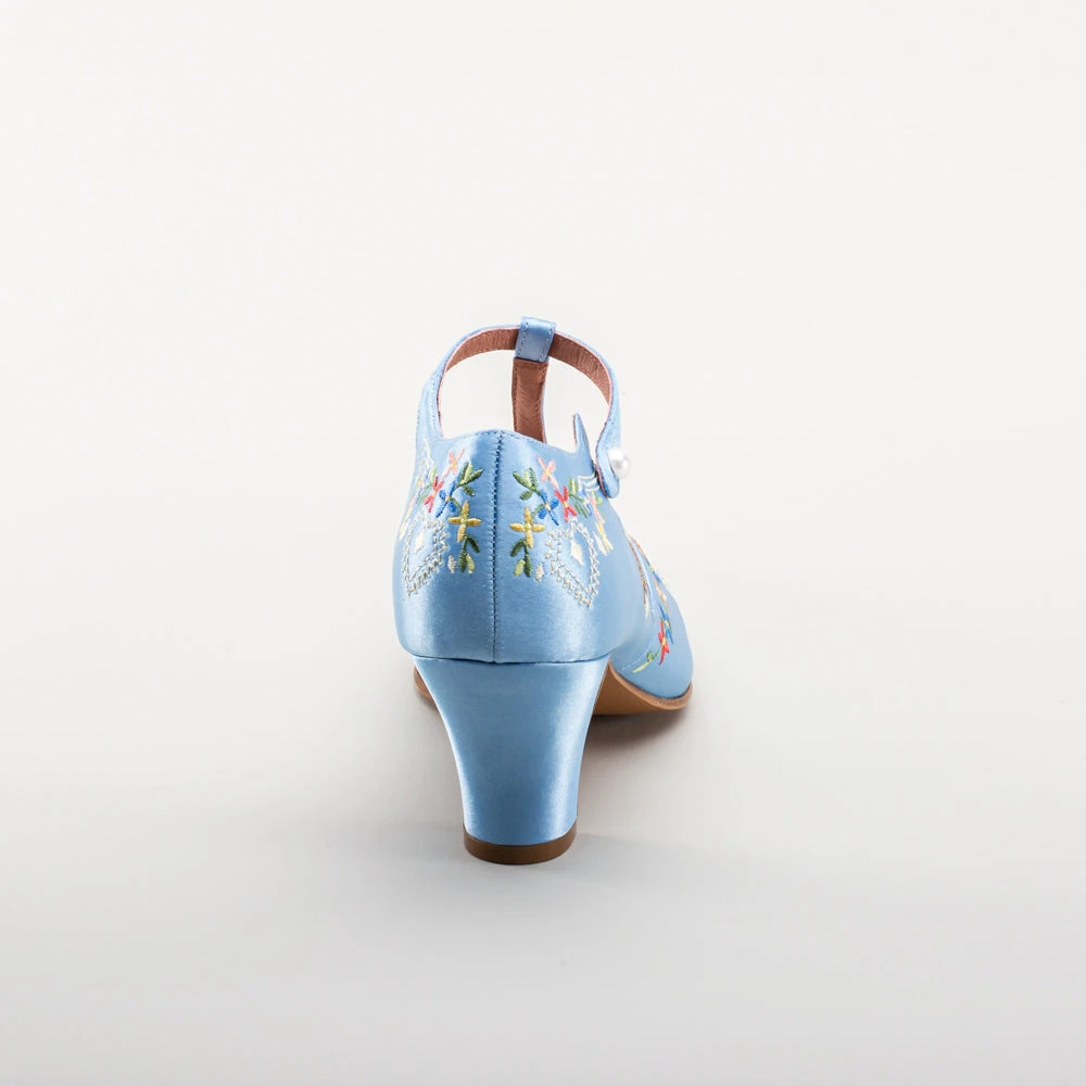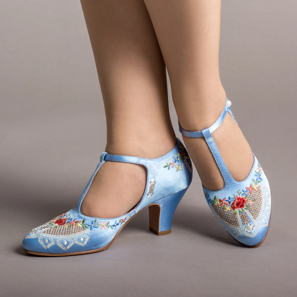 As hemlines rose in the 1920s, flashy footwear was all the rage, and the Daisy Embroidered T-Strap heels are just the ticket. Made in luminous satin heavily embroidered in a gorgeous botanical design, the Daisy T-Strap Shoes are closely based on an original pair in Bata Shoe Museum. These gorgeous shoes are accurate for the 1920s, 1930s, and 1940s, and offer our refined and stable 2.5 in / 6.3 cm Spanish heel paired with open sides and an almond toe.