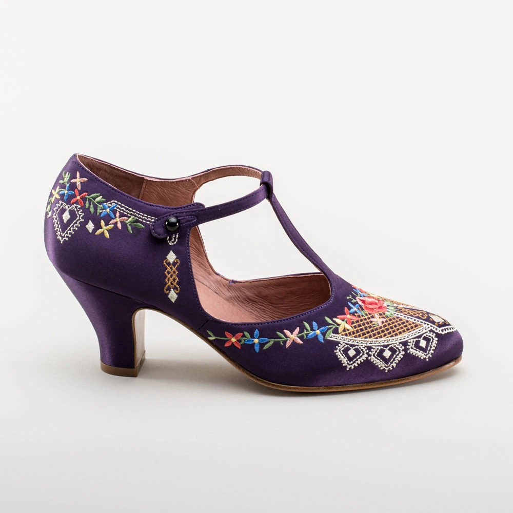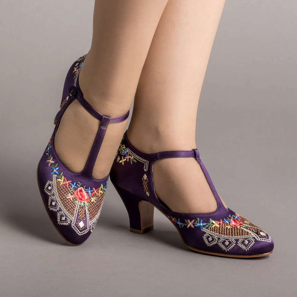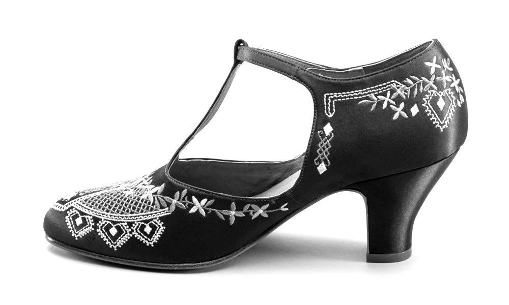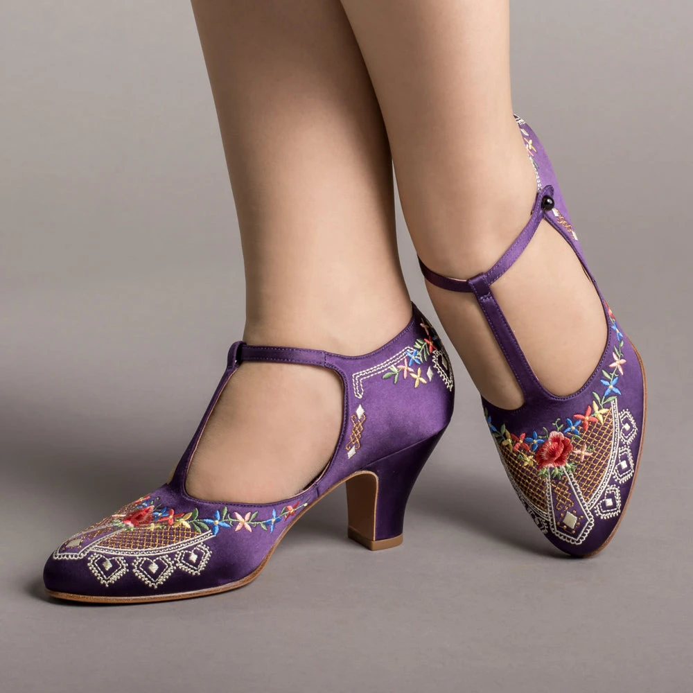 As hemlines rose in the 1920s, flashy footwear was all the rage, and the Daisy Embroidered T-Strap heels are just the ticket. Made in luminous satin heavily embroidered in a gorgeous botanical design, the Daisy T-Strap Shoes are closely based on an original pair in Bata Shoe Museum. These gorgeous shoes are accurate for the 1920s, 1930s, and 1940s, and offer our refined and stable 2.5 in / 6.3 cm Spanish heel paired with open sides and an almond toe.