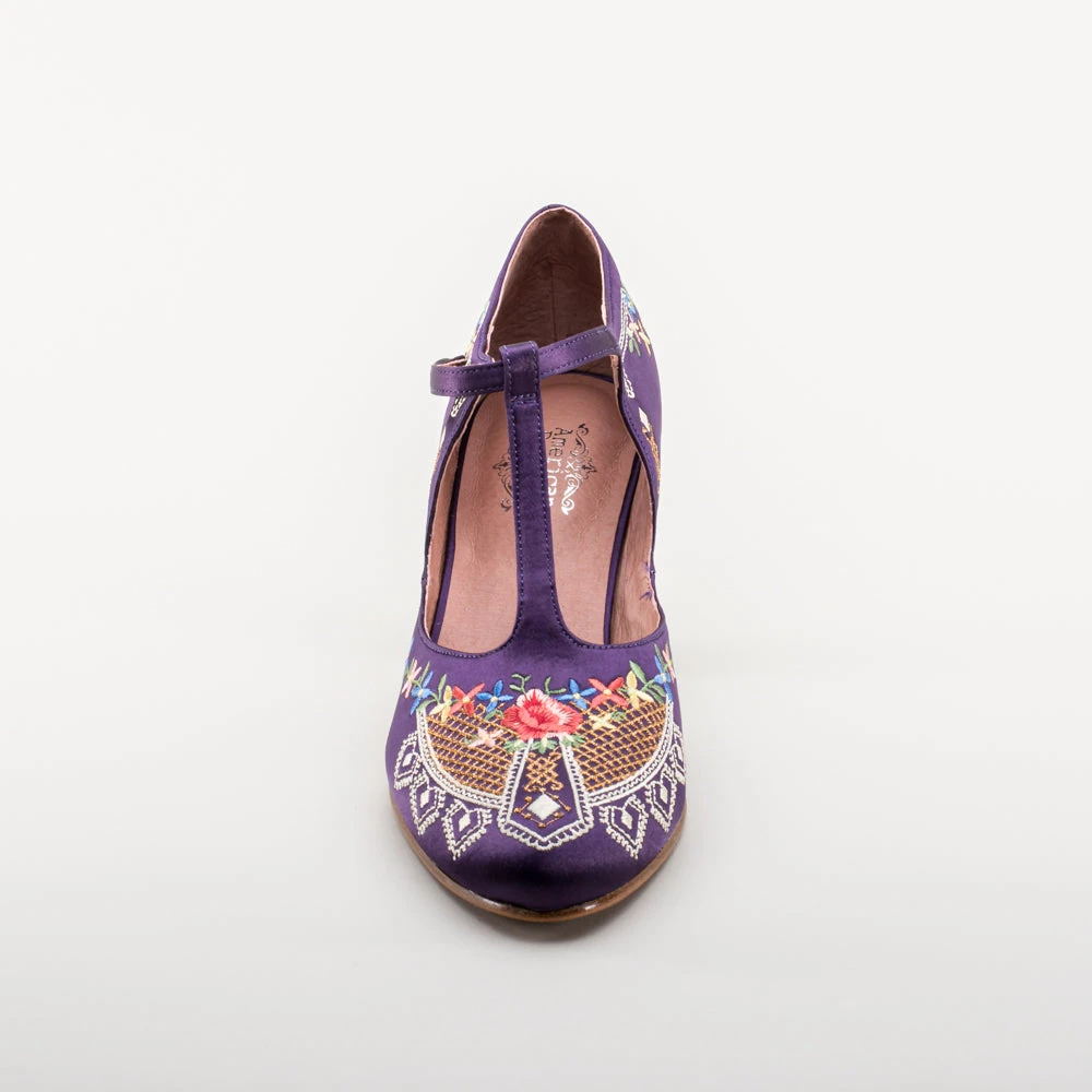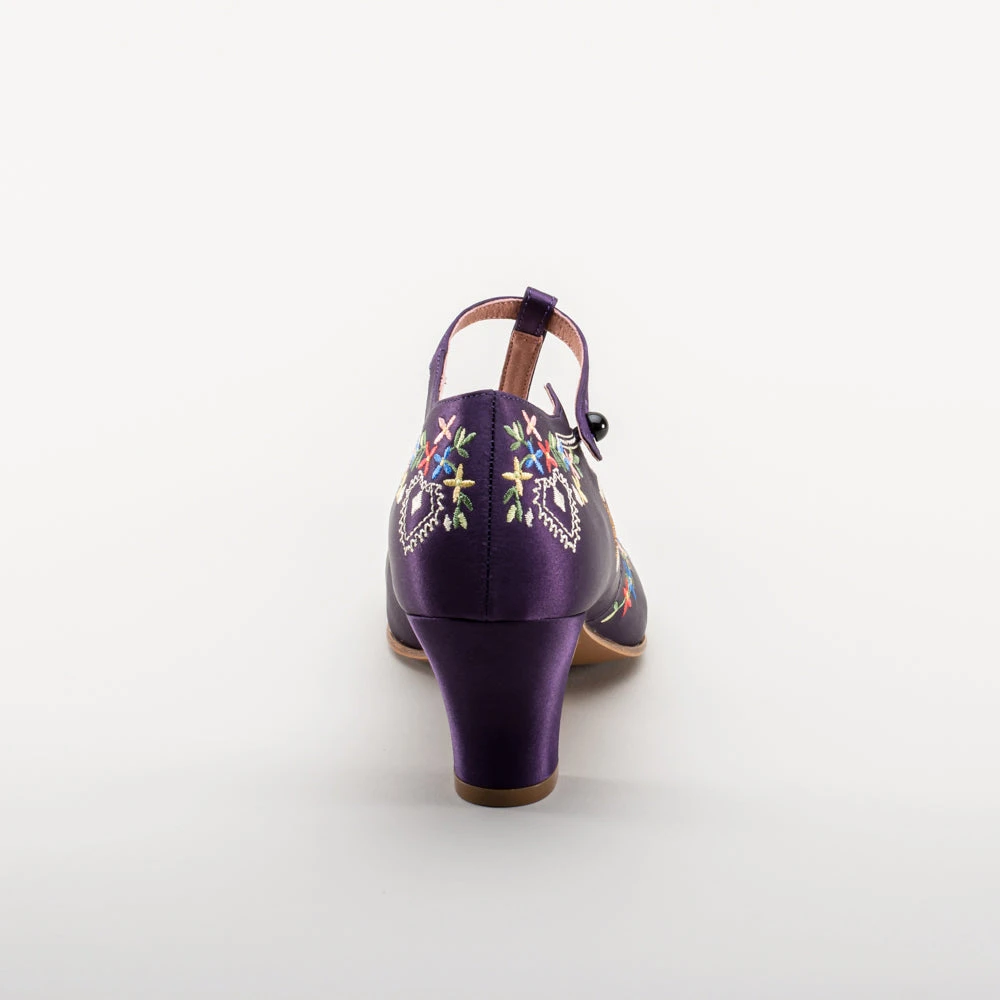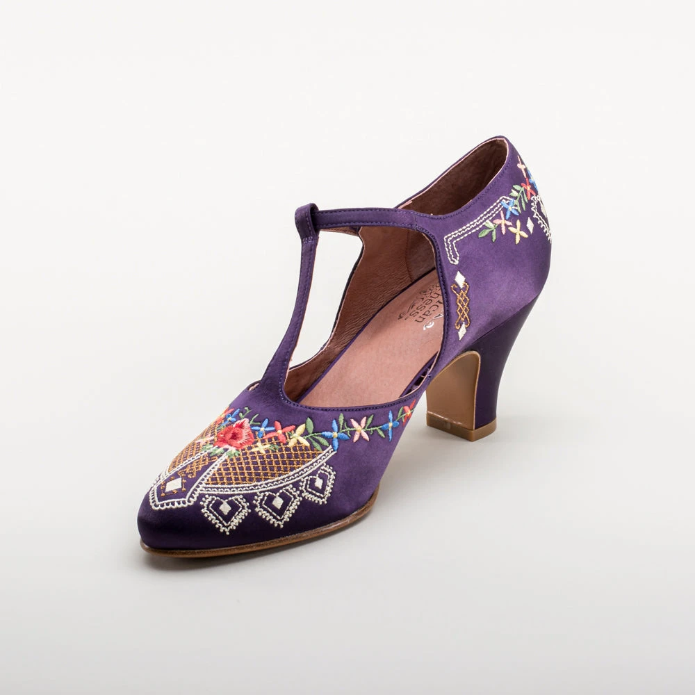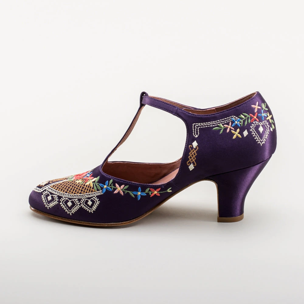 As hemlines rose in the 1920s, flashy footwear was all the rage, and the Daisy Embroidered T-Strap heels are just the ticket. Made in luminous satin heavily embroidered in a gorgeous botanical design, the Daisy T-Strap Shoes are closely based on an original pair in Bata Shoe Museum. These gorgeous shoes are accurate for the 1920s, 1930s, and 1940s, and offer our refined and stable 2.5 in / 6.3 cm Spanish heel paired with open sides and an almond toe.