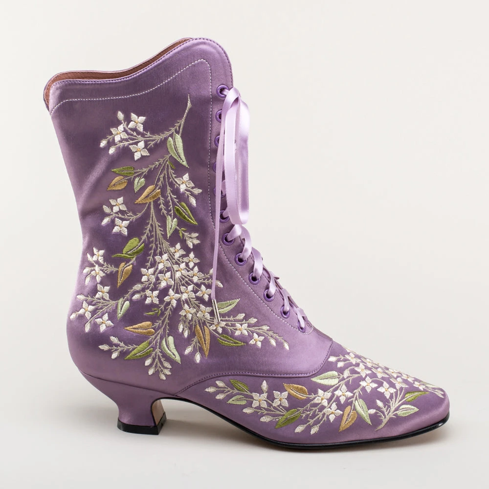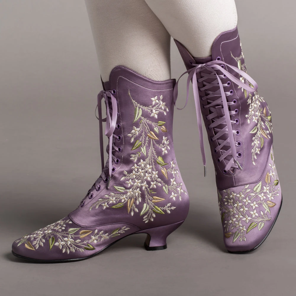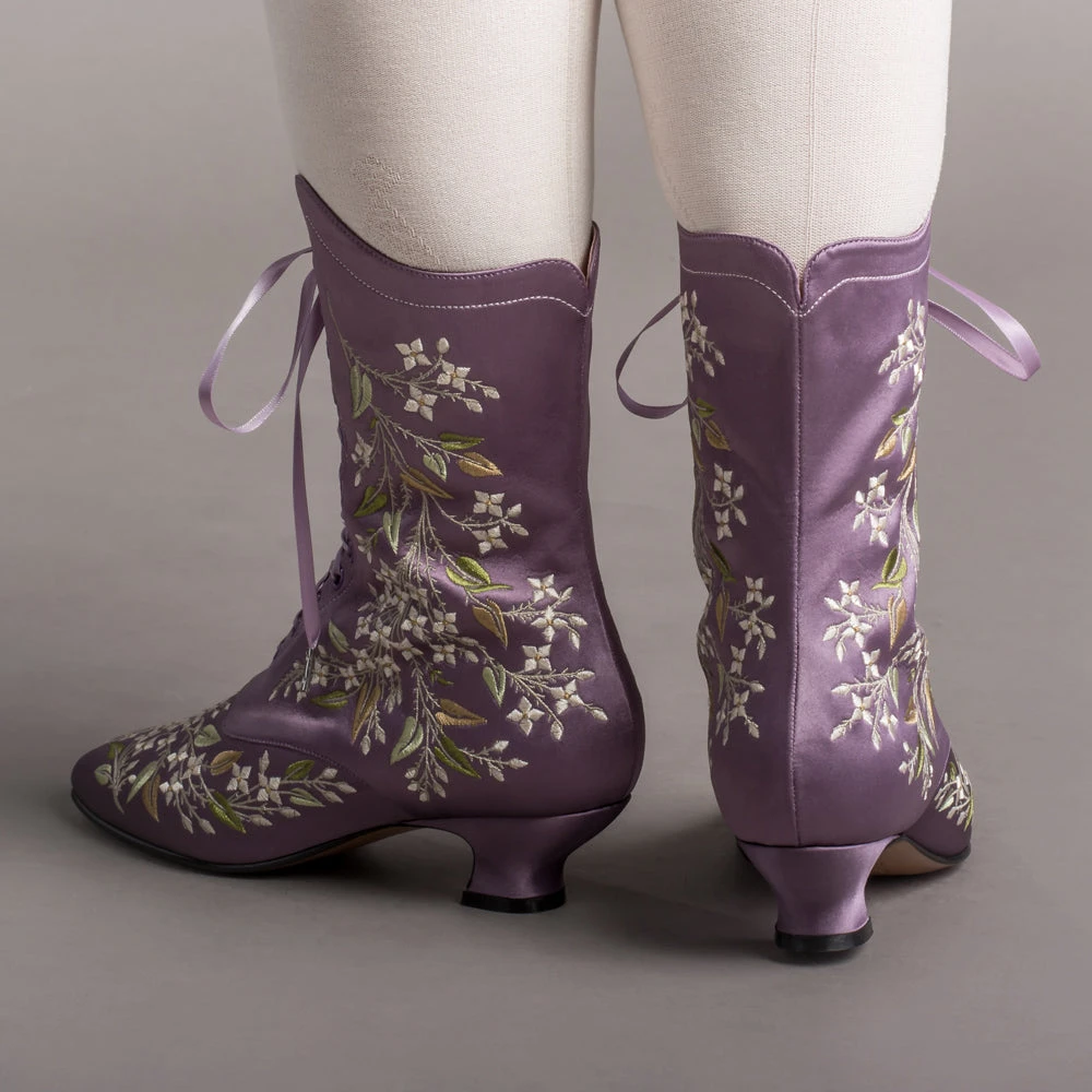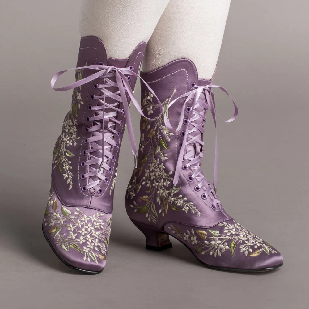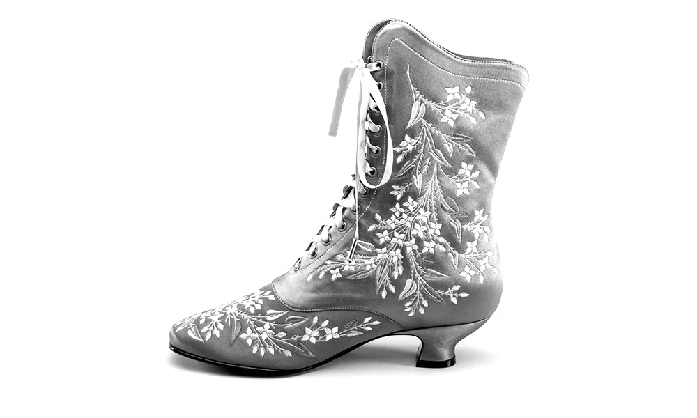 Indulge in a piece of history with Flora Embroidered Boots, an exclusive reproduction of the intricate opera and evening boots popular in the late Victorian period. Expertly crafted with intricate botanical detailing, these stunning satin boots will take you back to an era of sophistication and finesse. Wear them with bustle and Belle Epoque attire from the 1870s to c. 1900, or with modern dress as a statement piece.