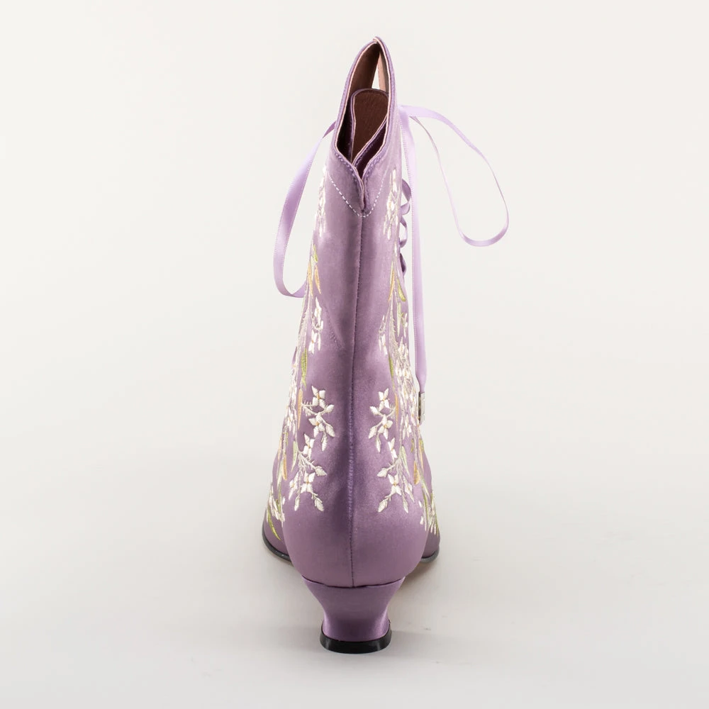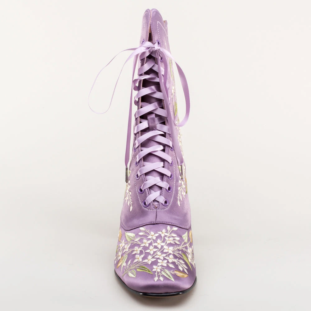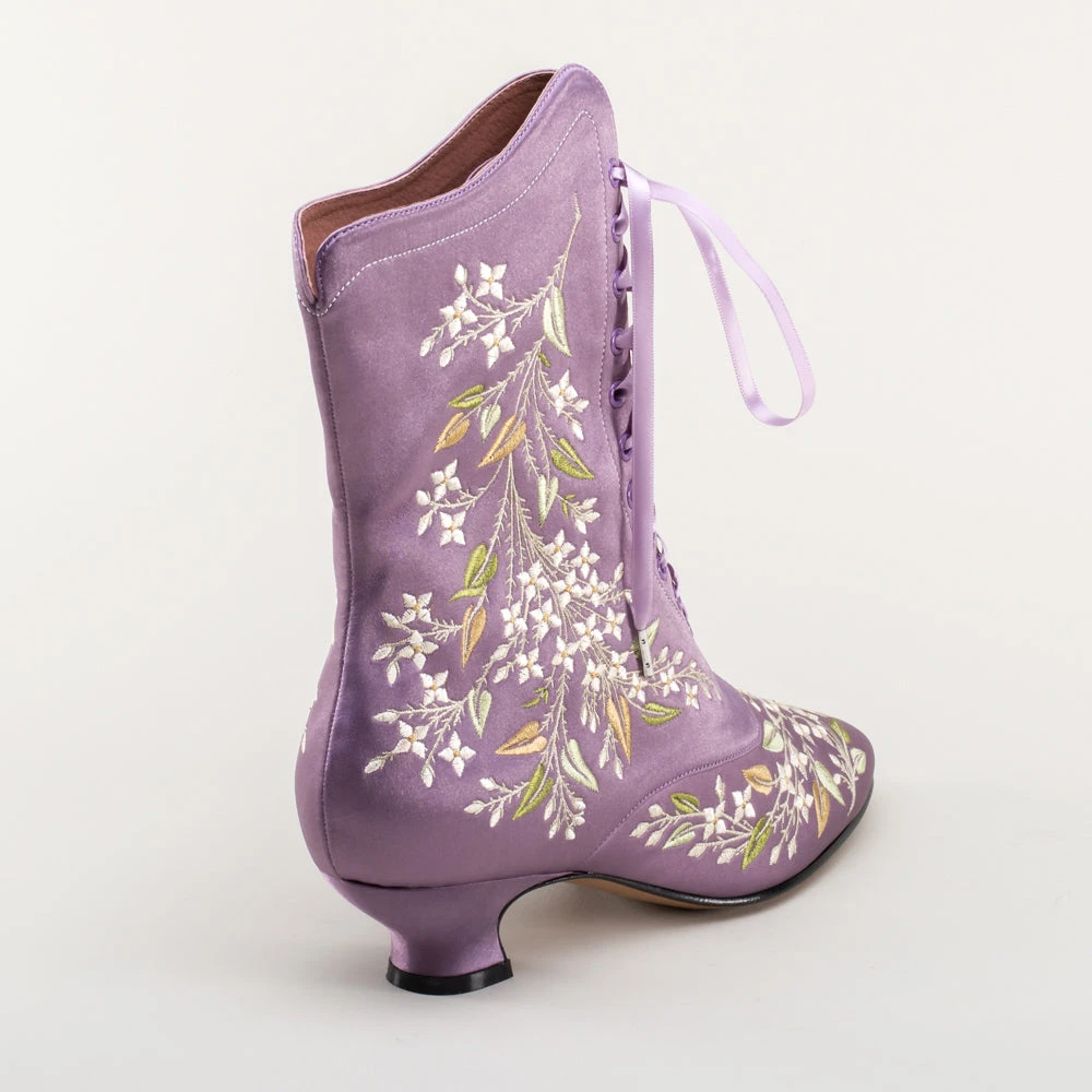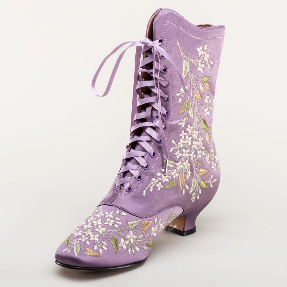 Indulge in a piece of history with Flora Embroidered Boots, an exclusive reproduction of the intricate opera and evening boots popular in the late Victorian period. Expertly crafted with intricate botanical detailing, these stunning satin boots will take you back to an era of sophistication and finesse. Wear them with bustle and Belle Epoque attire from the 1870s to c. 1900, or with modern dress as a statement piece.