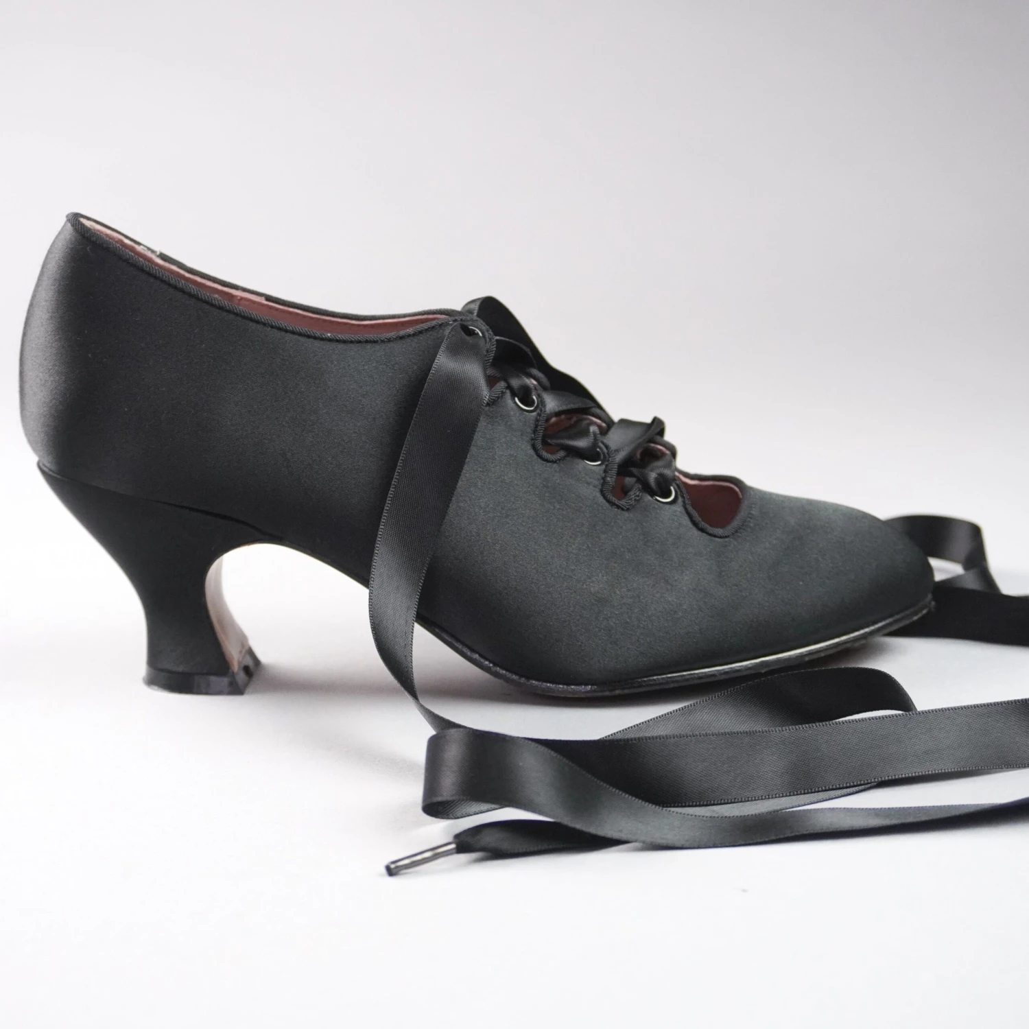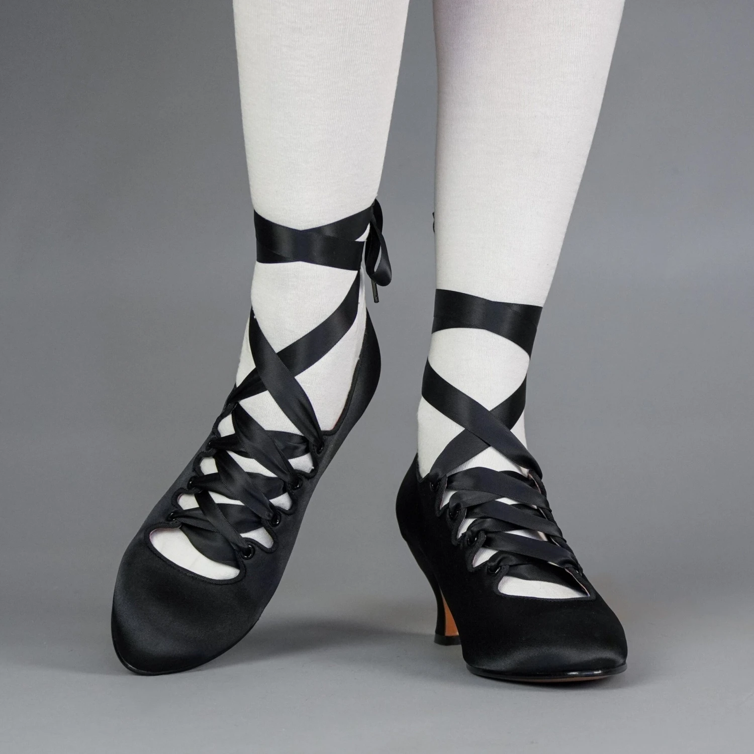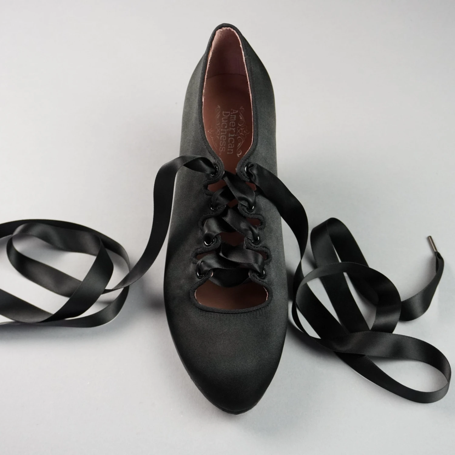 Embody the height of 1910s fashion with these gorgeous Foxtrot pumps! Accurate to 1910 through the 1920s, Foxtrot is based on the oh-so in vogue lace-up shoes of the late Edwardian era. Foxtrot features perfectly balanced, custom 2.5″/6.3 cm French heels, almond-shaped toes, and sleek satin uppers. Serpentine tabs laced with double-faced satin ribbons make this curvy pump one-of-a-kind. Foxtrot comes with two sets of ribbon laces, for adjustable sizing. Wear them with historical costumes, contemporary evening-wear, Lolita coords, or your favorite dress for a touch of glamour.