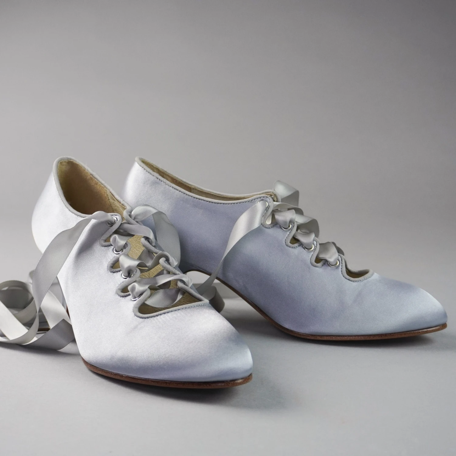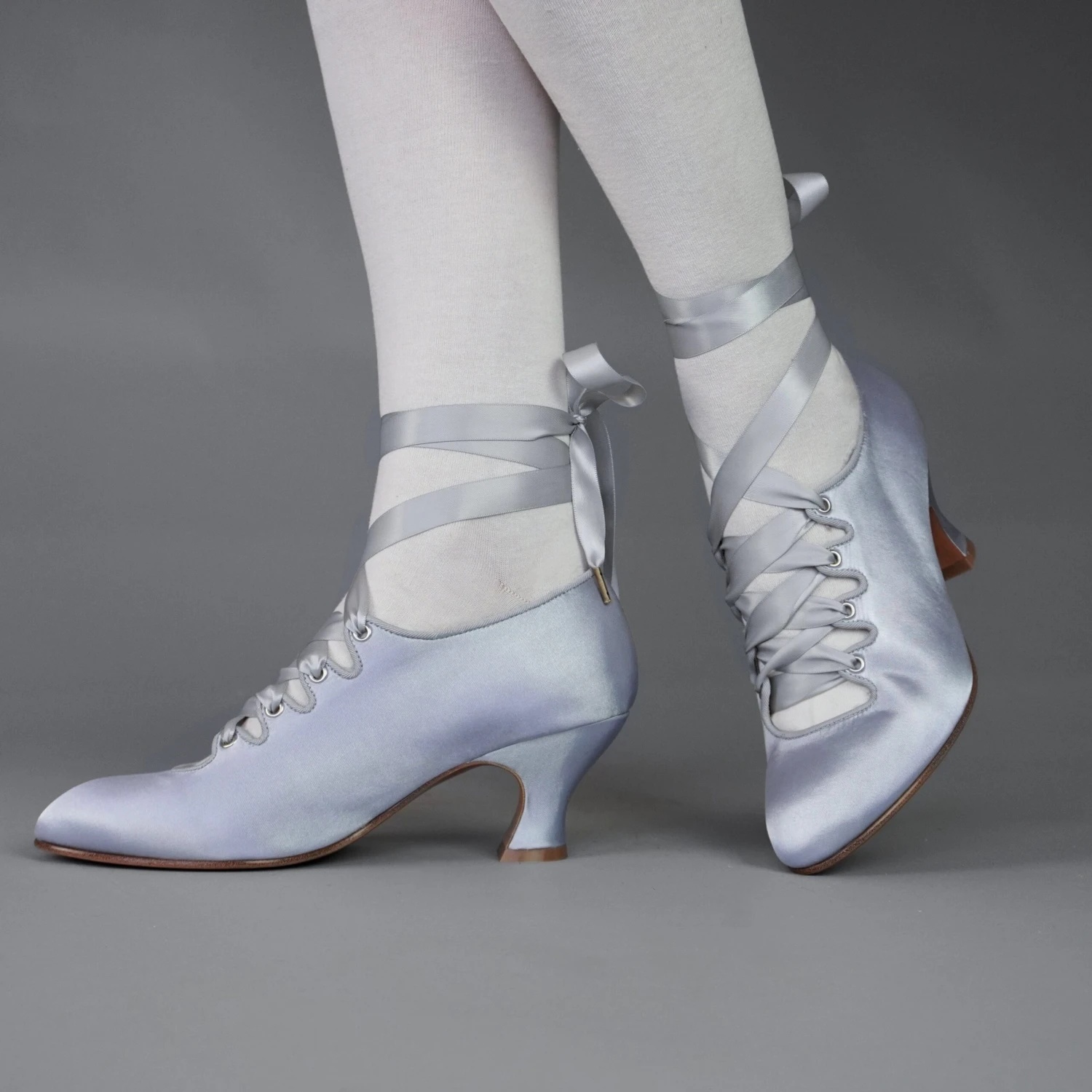 Embody the height of 1910s fashion with these gorgeous Foxtrot pumps! Accurate to 1910 through the 1920s, Foxtrot is based on the oh-so in vogue lace-up shoes of the late Edwardian era. Foxtrot features perfectly balanced, custom 2.5″/6.3 cm French heels, almond-shaped toes, and sleek satin uppers. Serpentine tabs laced with double-faced satin ribbons make this curvy pump one-of-a-kind. Foxtrot comes with two sets of ribbon laces, for adjustable sizing. Wear them with historical costumes, contemporary evening-wear, Lolita coords, or your favorite dress for a touch of glamour.