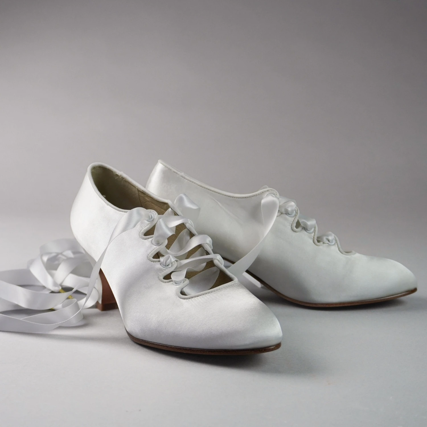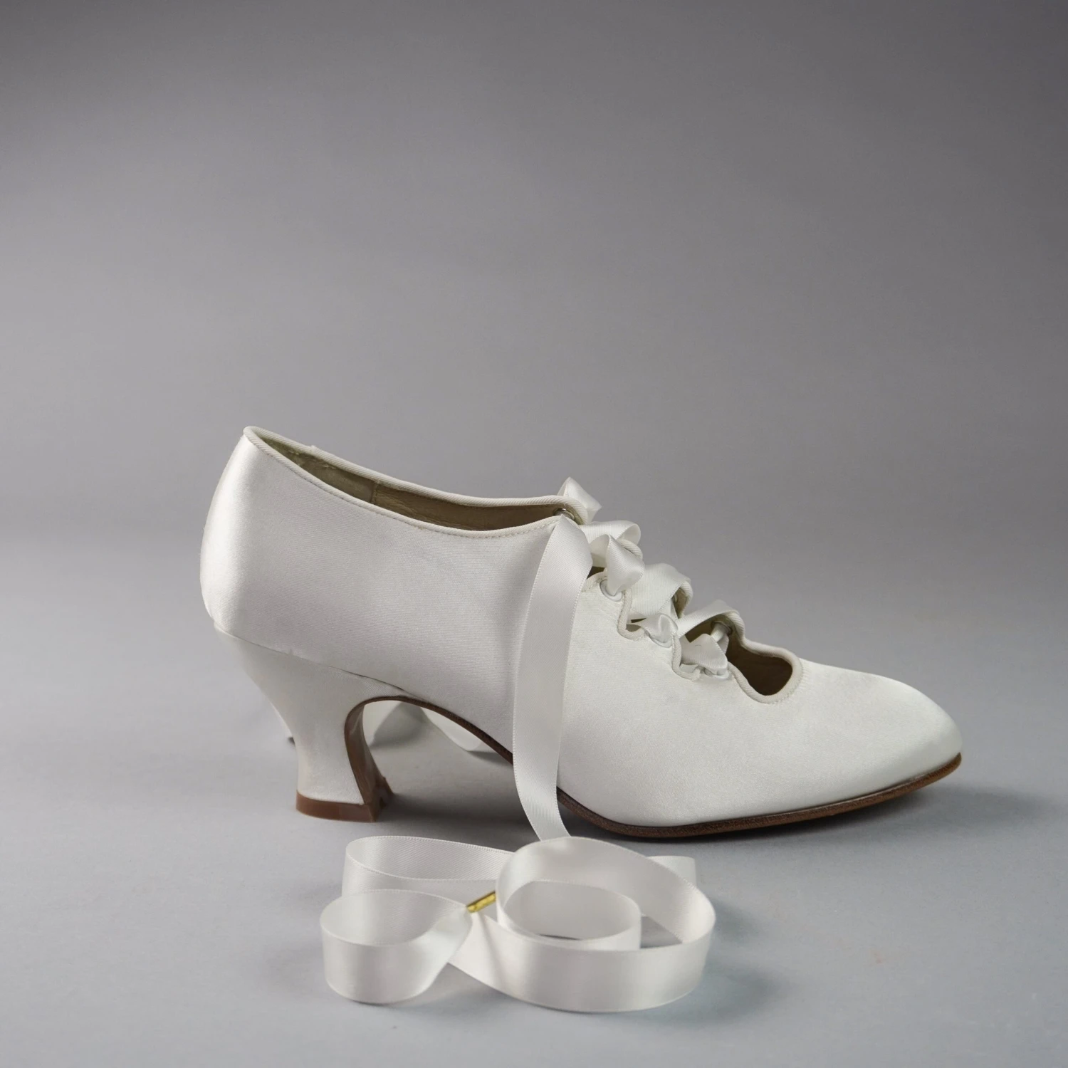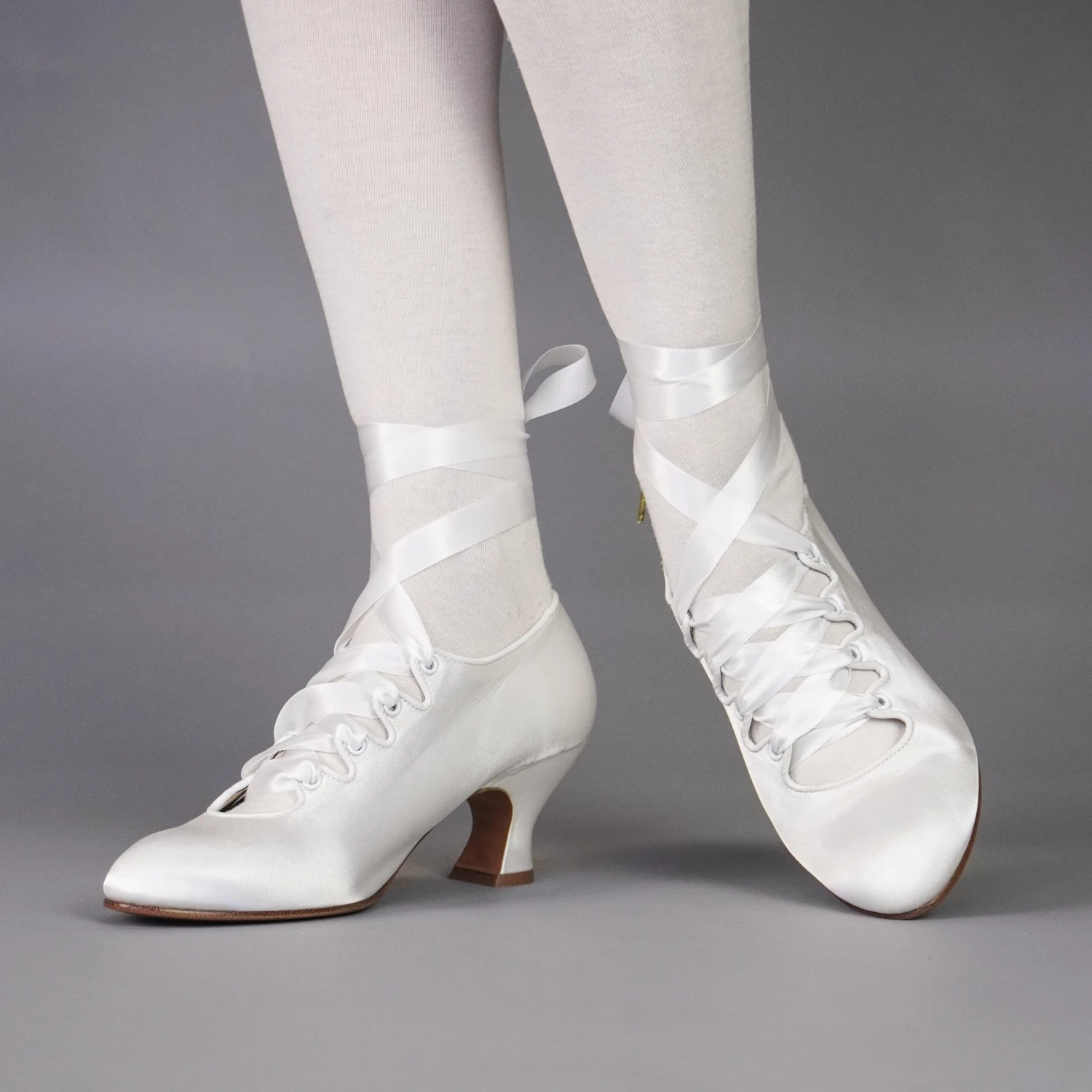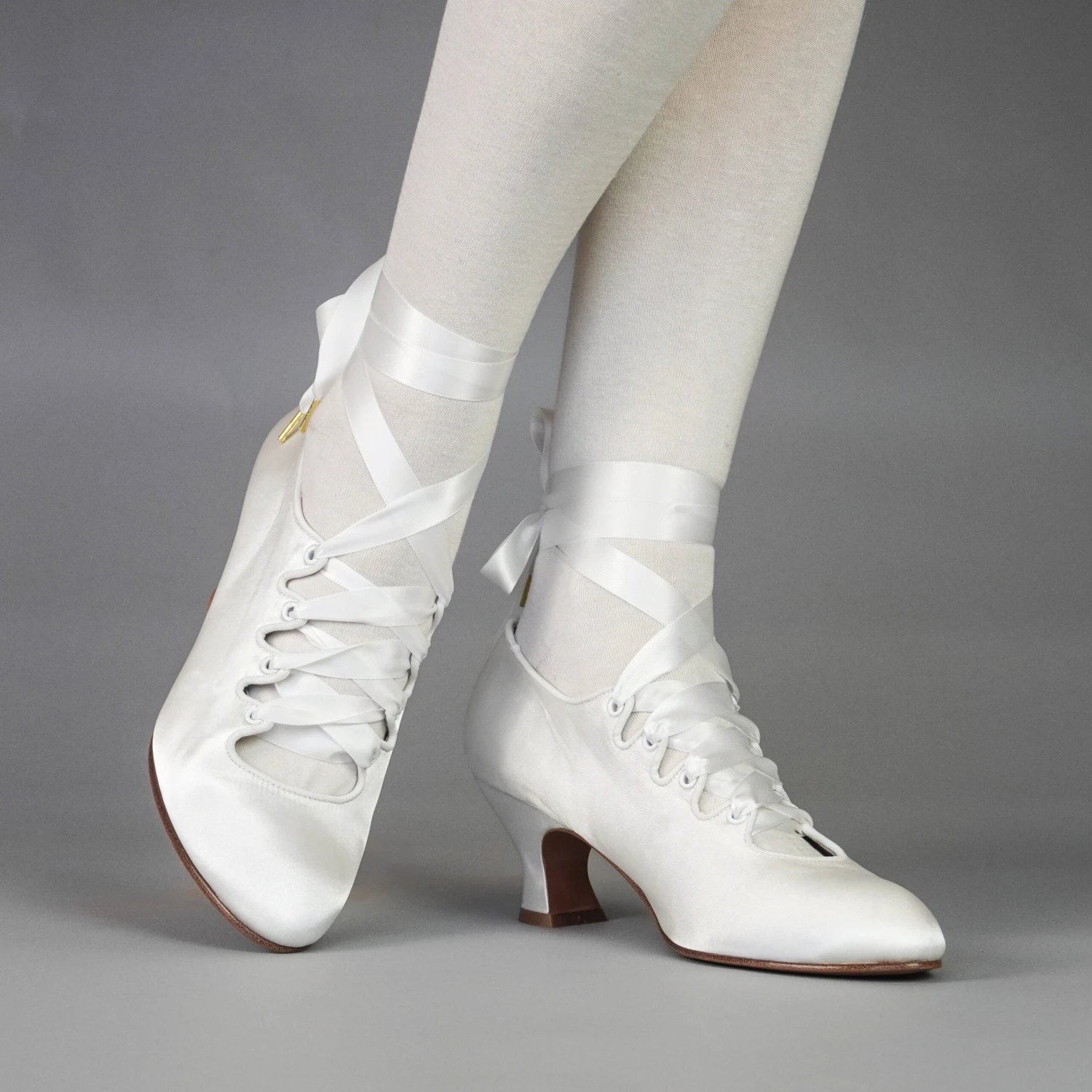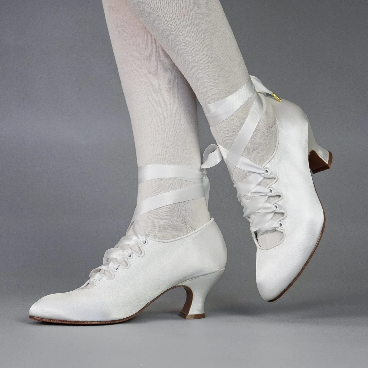 Embody the height of 1910s fashion with these gorgeous Foxtrot pumps! Accurate to 1910 through the 1920s, Foxtrot is based on the oh-so in vogue lace-up shoes of the late Edwardian era. Foxtrot features perfectly balanced, custom 2.5″/6.3 cm French heels, almond-shaped toes, and sleek satin uppers. Serpentine tabs laced with double-faced satin ribbons make this curvy pump one-of-a-kind. Foxtrot comes with two sets of ribbon laces, for adjustable sizing. Wear them with historical costumes, contemporary evening-wear, Lolita coords, or your favorite dress for a touch of glamour.