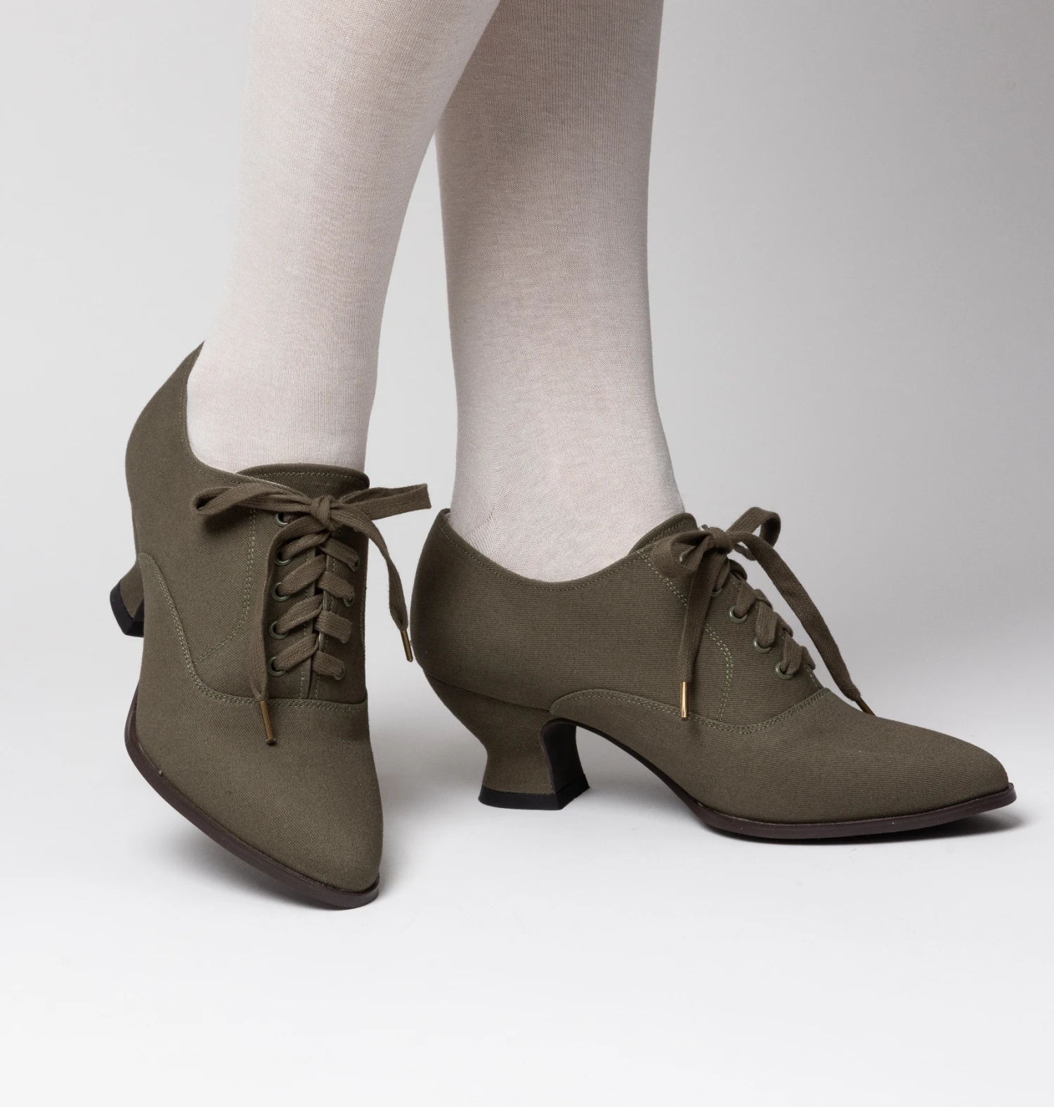 Meet the Kedwardians, the perfect light and breezy sporting shoes from the turn of the 20th century. Based on many original examples of early ladies’ tennis shoes, the Kedwardians are made inside and out in cotton canvas paired with practical rubber soles and a stable and comfortable 2 in / 5 cm French heel. These Edwardian tennis shoes are leather-free, lightweight, easy to clean, and extremely comfortable.