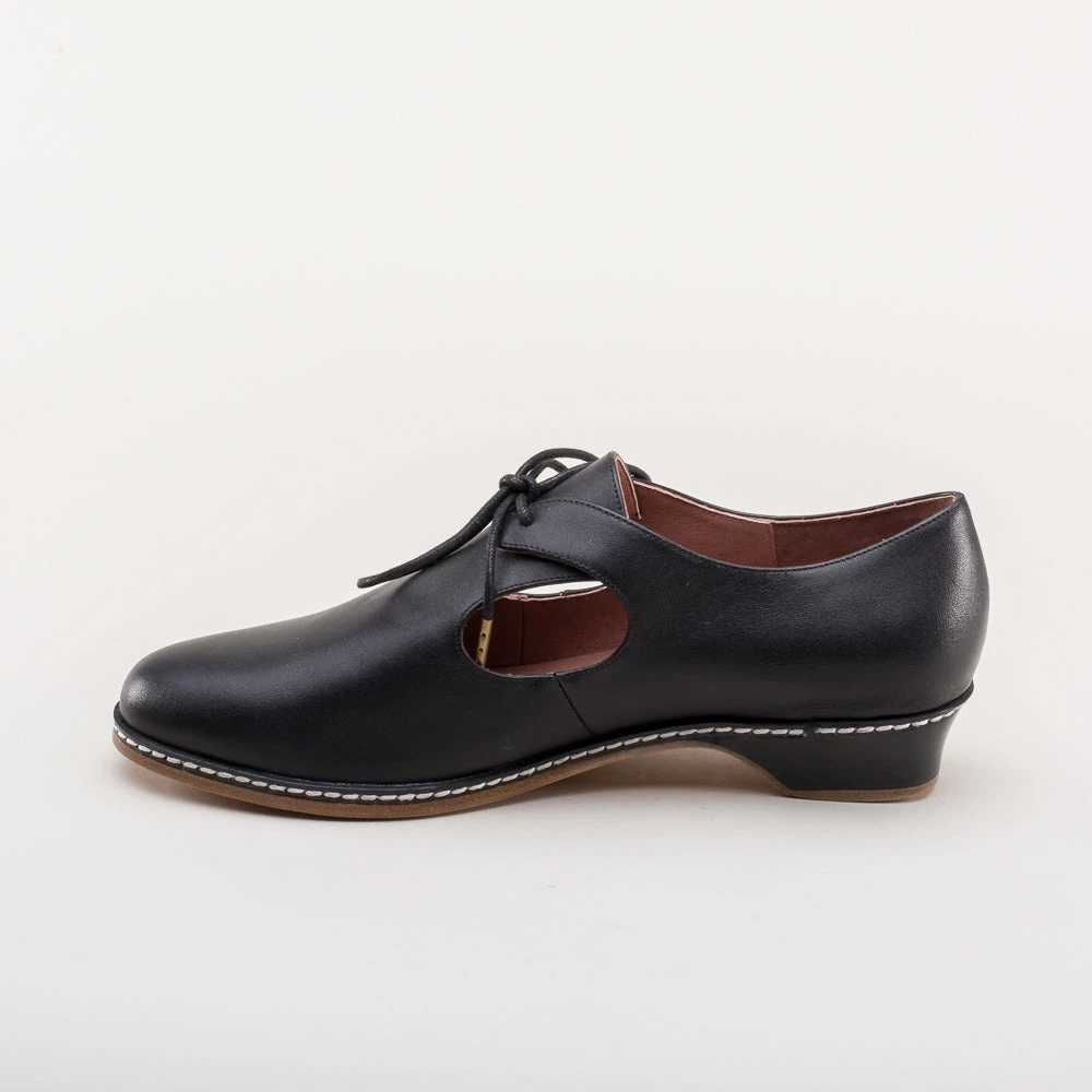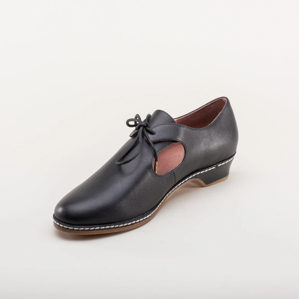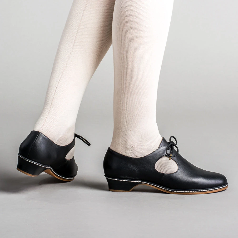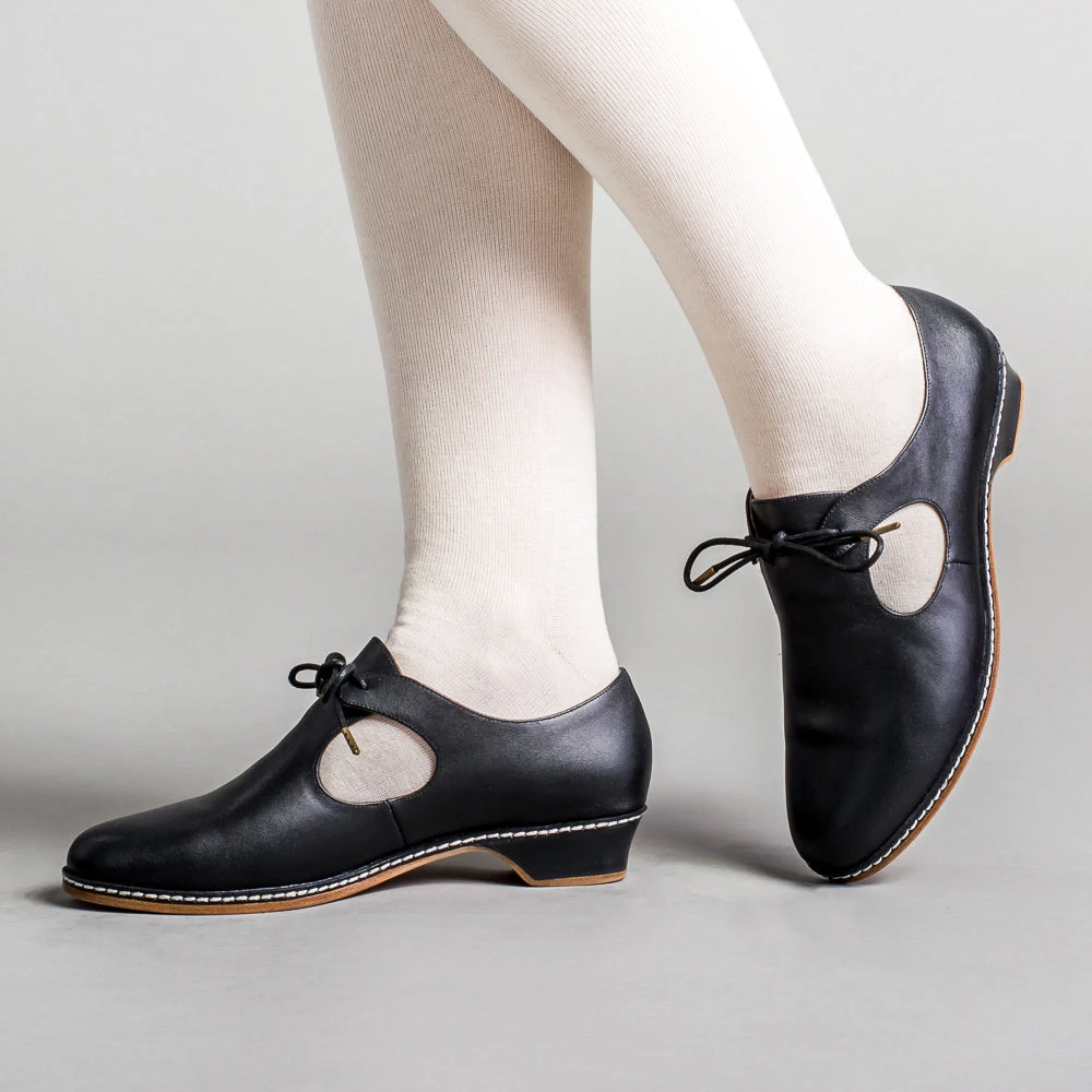 The unique styling of Elizabethan and Renaissance heeled shoes is brought to life with our Mary. A tie closure, open sides, and a low, practical heel makes these late Renaissance era shoes perfect for both indoor and outdoor fairs and events.