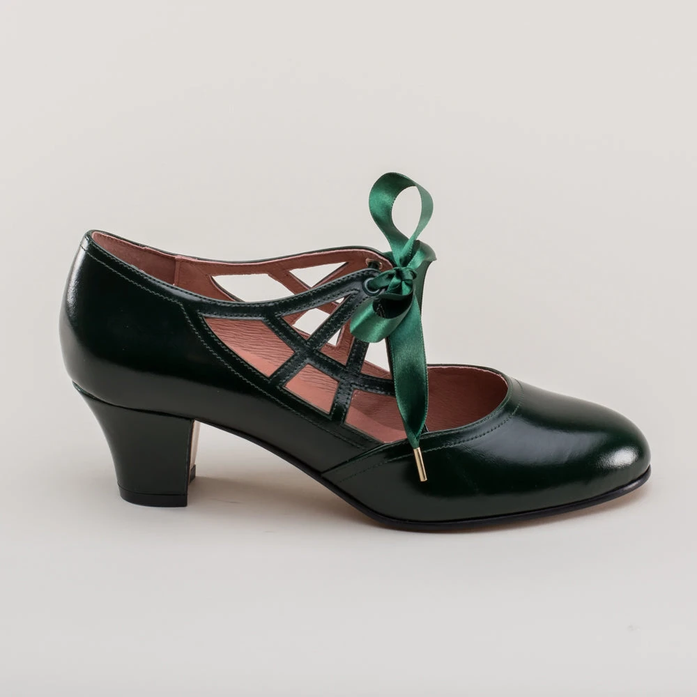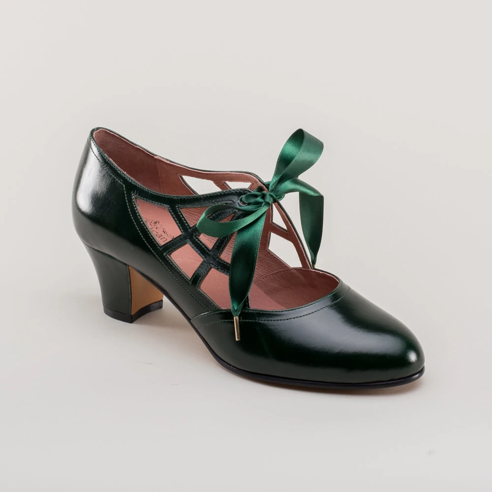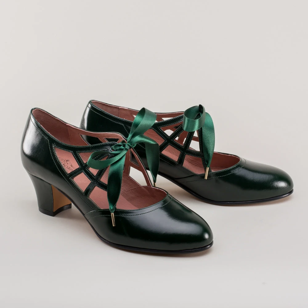 Meet the fantastically spooky Parker pumps, perfectly period for the 1920s all the way through to the 1960s. These fun and funky little vintage shoes feature round toes, a new 2 in / 5 cm Cuban heel, and the eye-catching spiderweb vamp with satin ribbon ties. These cuties are direct reproductions of an extant pair of 1920s shoes along with the catalog advertisement.