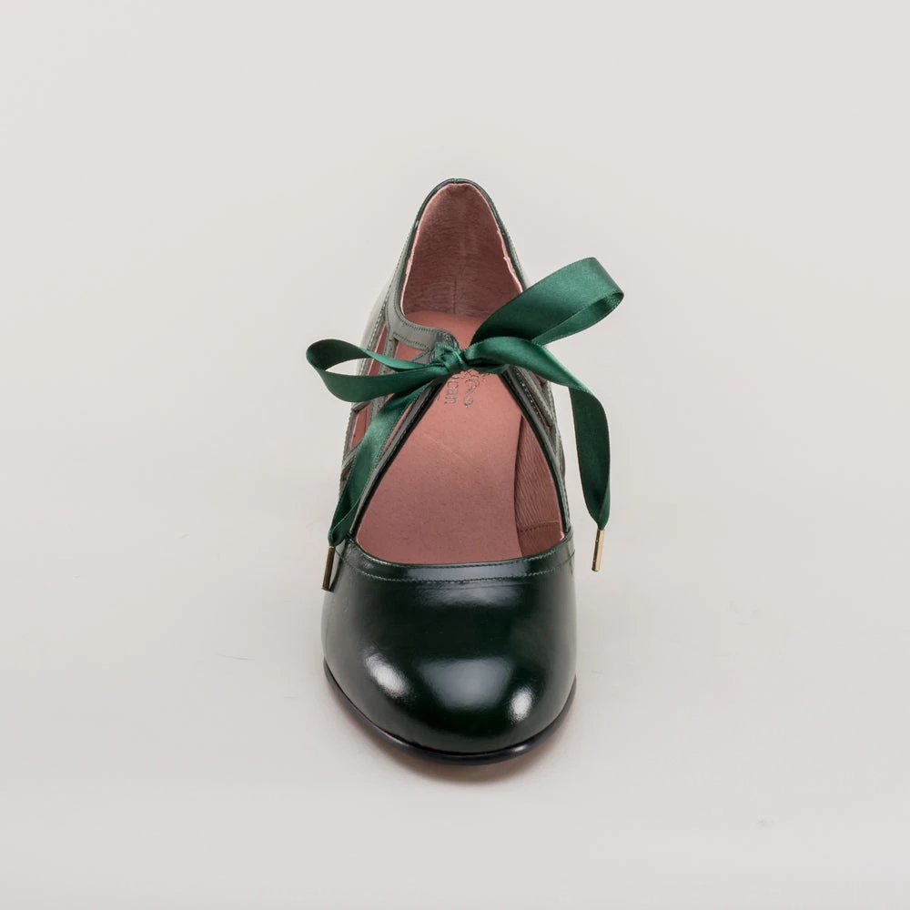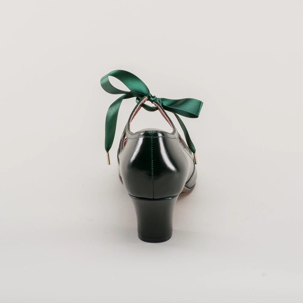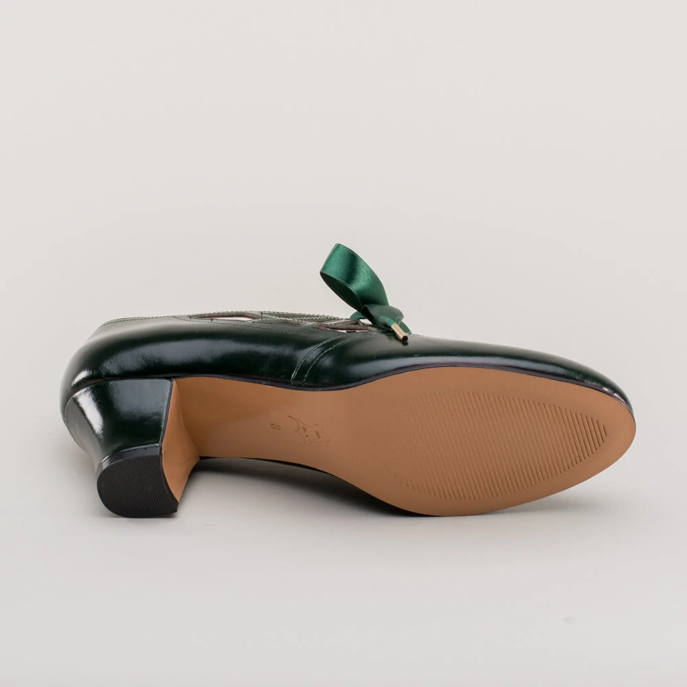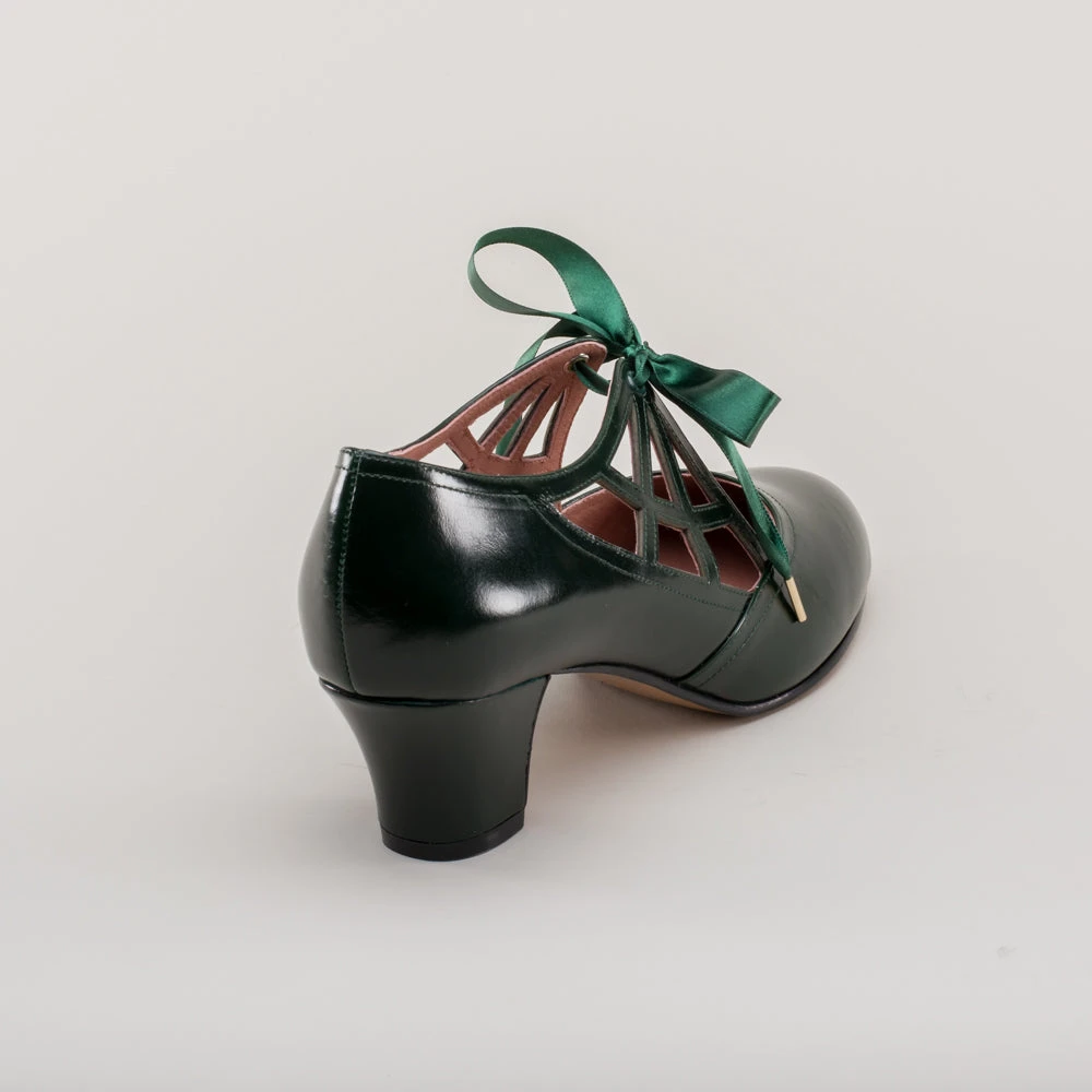 Meet the fantastically spooky Parker pumps, perfectly period for the 1920s all the way through to the 1960s. These fun and funky little vintage shoes feature round toes, a new 2 in / 5 cm Cuban heel, and the eye-catching spiderweb vamp with satin ribbon ties. These cuties are direct reproductions of an extant pair of 1920s shoes along with the catalog advertisement.