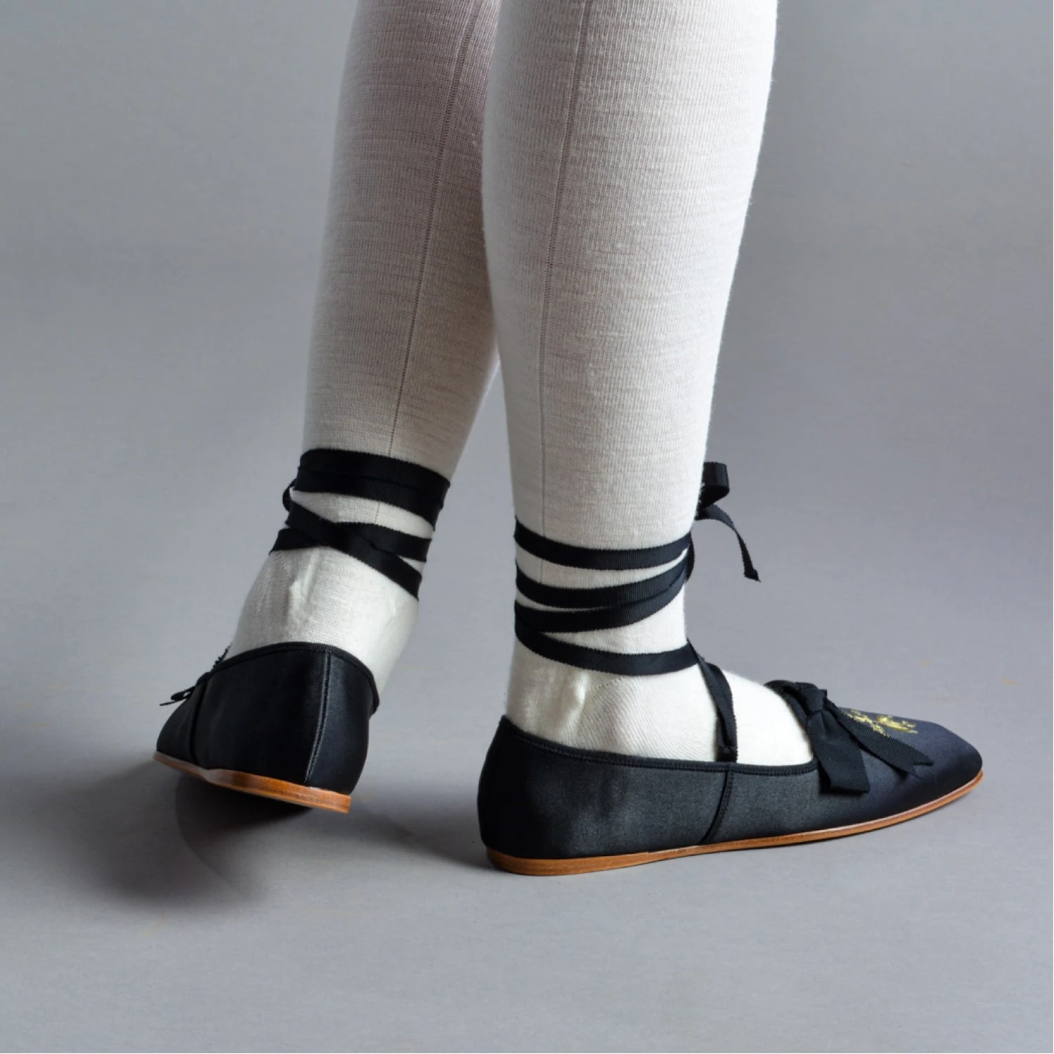 Bring your Regency dreams to life with the perfect pair of delicate dancing slippers. The Penelope slippers offer beauty, comfort, and versatility with so many color pairings, ways to wear the ribbons, and a soft yet durable construction.