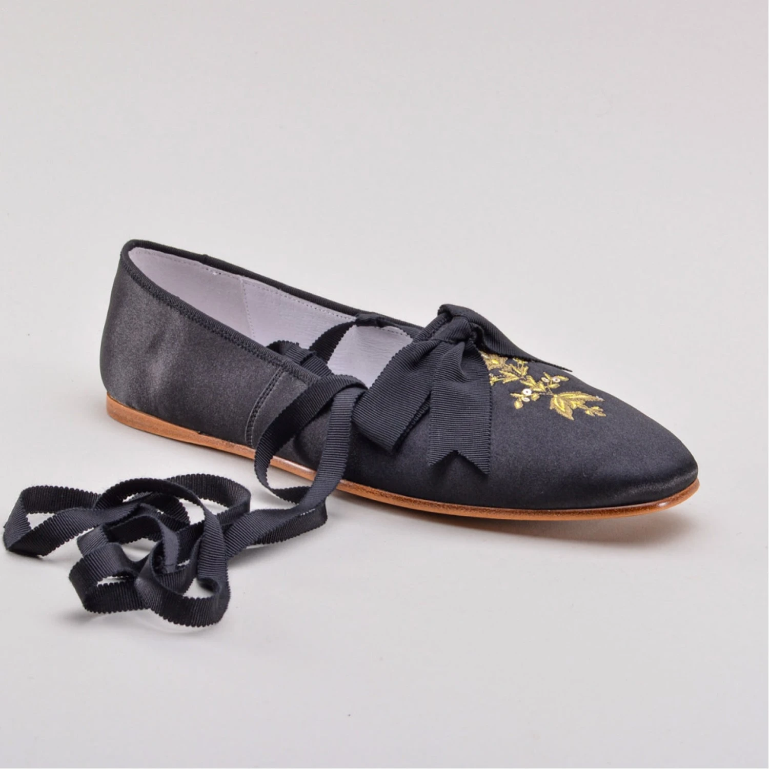 These slip-on shoes are accurate for c. 1800 – 1830. They feature a beautiful satin upper embroidered with a historical design on the vamp, complete with spangles. The edges are bound in petersham, with matching optional ankle ribbons and vamp bow which is easily removed. Period-correct turnshoe construction, soft square toe, and real leather soles make the Penelopes unmatched for evening and formal events where the prettiest of shoes are required. Wear them for Jane Austen, Napoleonic, War of 1812, and all Regency events.