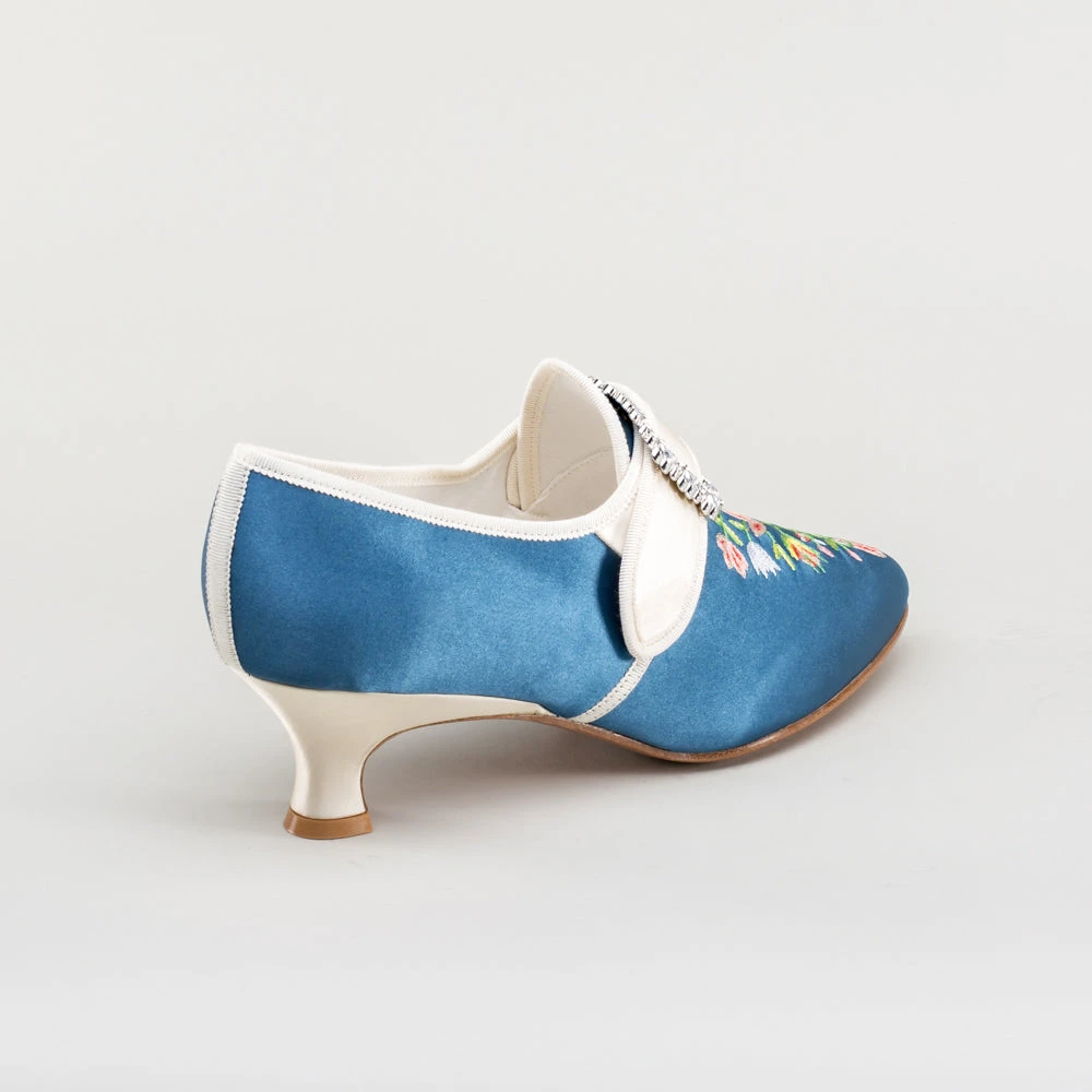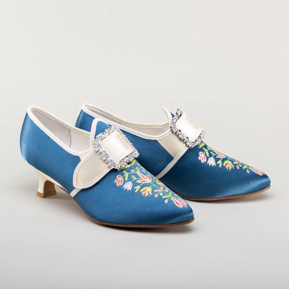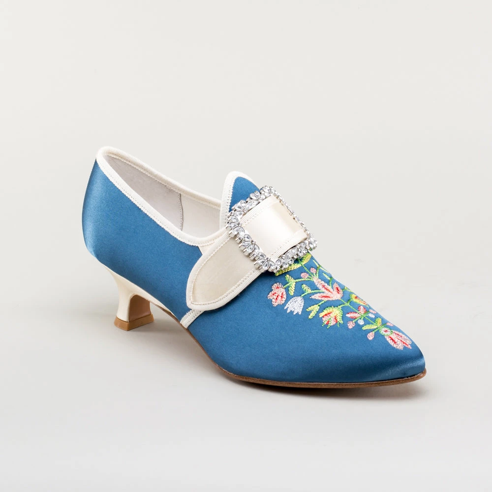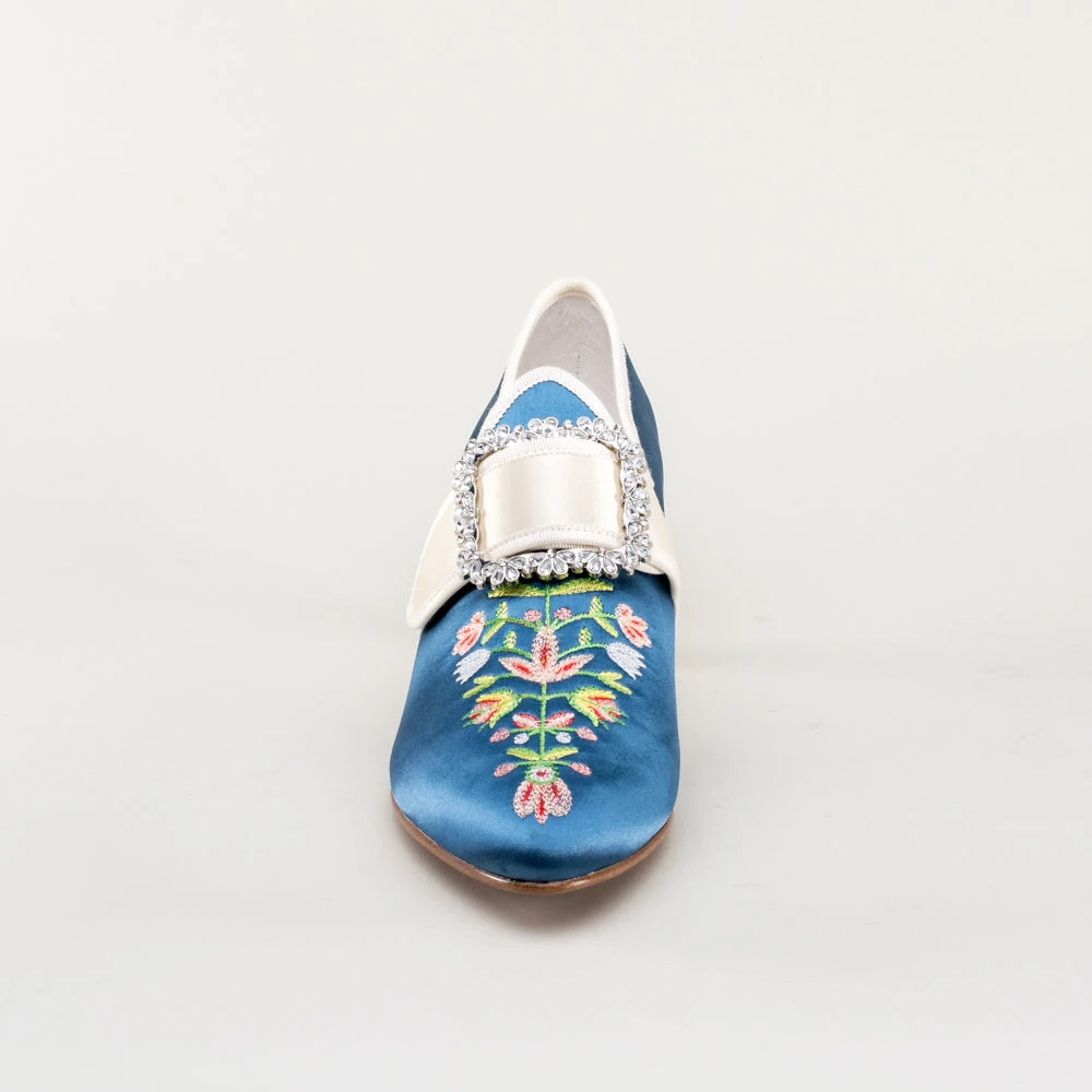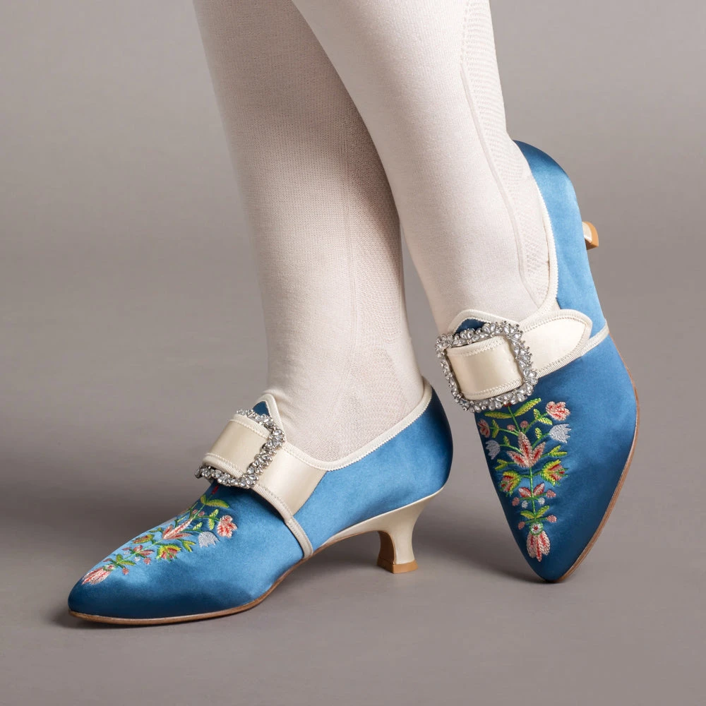 Step back in time with the delicious Primrose 18th century shoes. This authentic embroidered satin design has been recreated in collaboration with The Bata Shoe Museum, capturing the look and feel of the original shoes from 1770s-1790s. Made on the Dunmore last and 2 inch / 5 cm heel, you can be sure that style doesn’t mean sacrificing comfort.