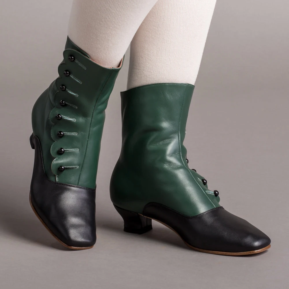 These mid-Victorian and Bustle Era boots have square toes, a short heel molded from an original, and an attractive scalloped edge and top, making them practical yet feminine, and ideal for a fashionable Victorian lady.