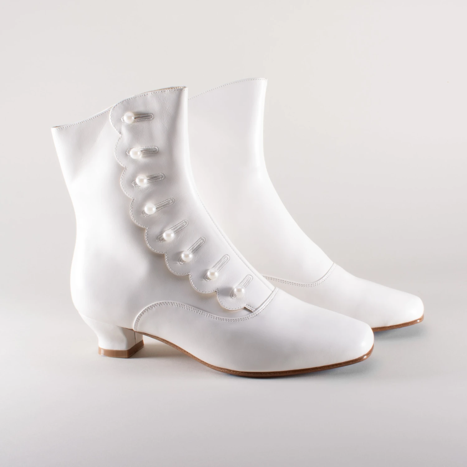 These mid-Victorian and Bustle Era boots have square toes, a short heel molded from an original, and an attractive scalloped edge and top, making them practical yet feminine, and ideal for a fashionable Victorian lady.