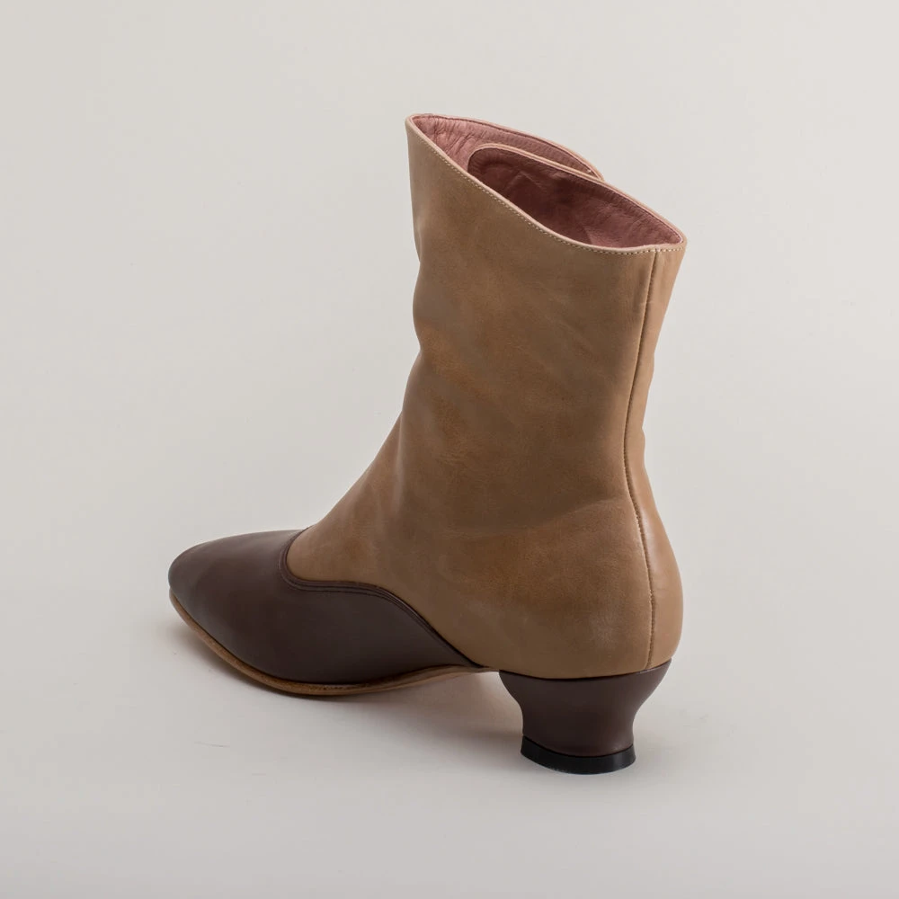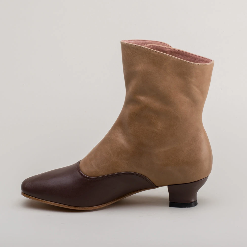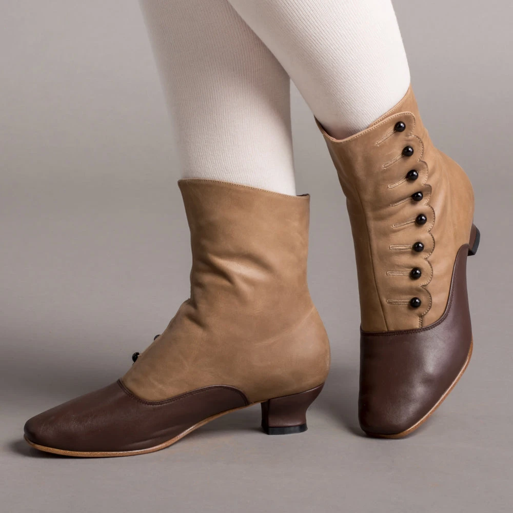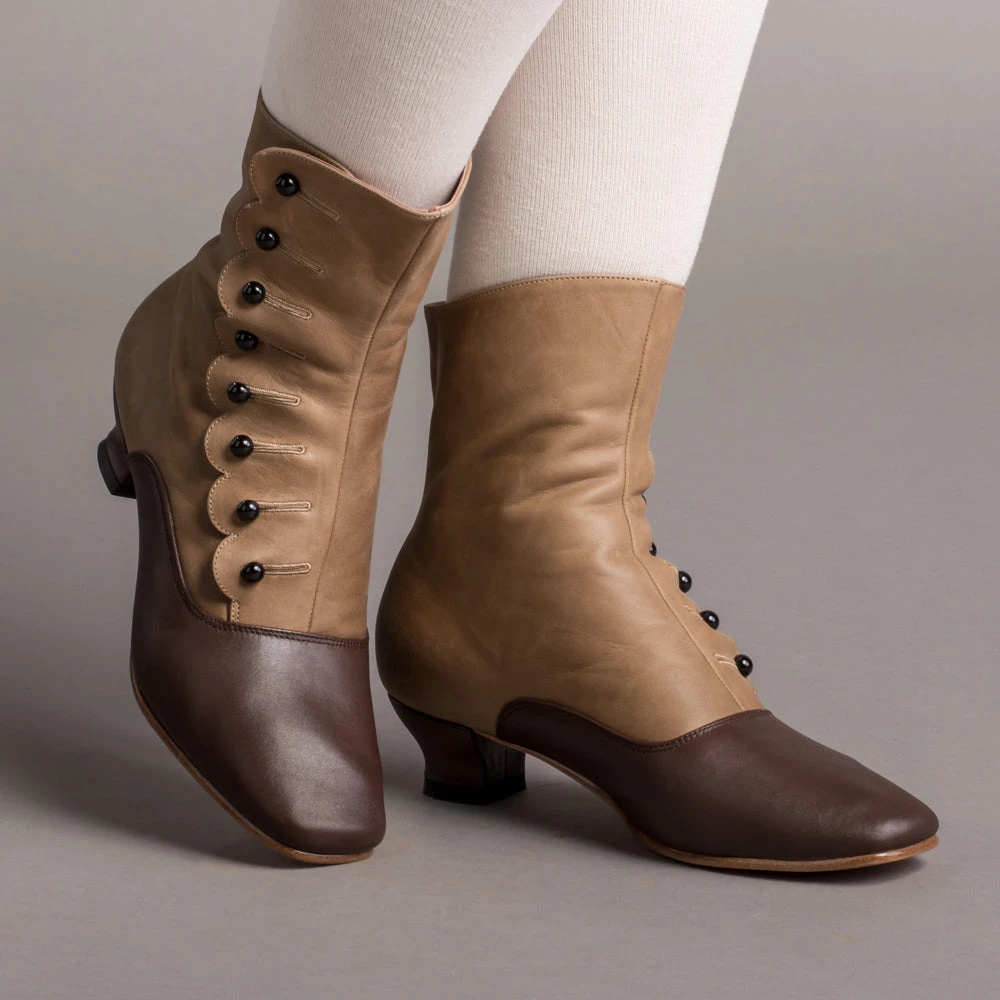 These mid-Victorian and Bustle Era boots have square toes, a short heel molded from an original, and an attractive scalloped edge and top, making them practical yet feminine, and ideal for a fashionable Victorian lady.
