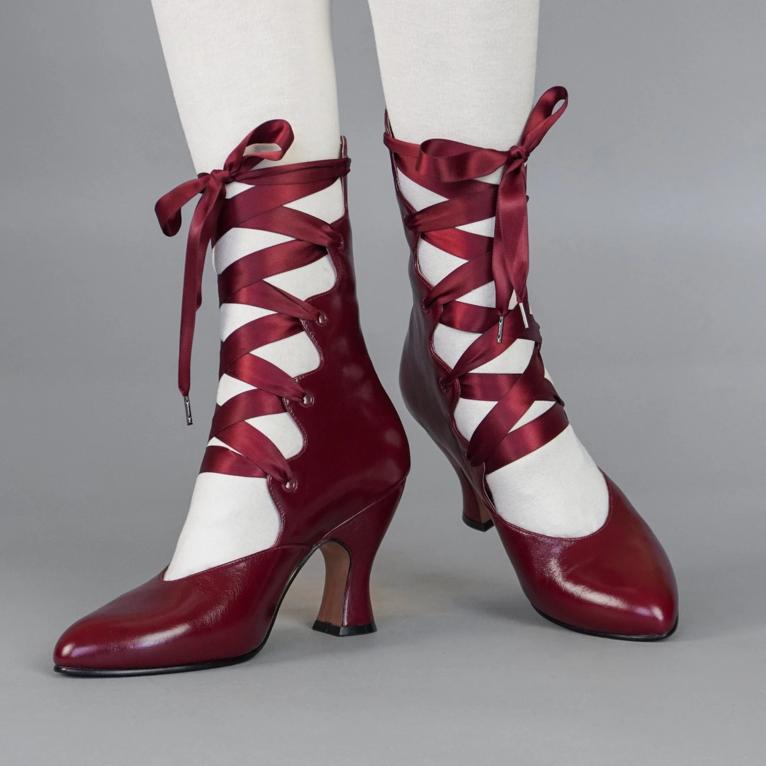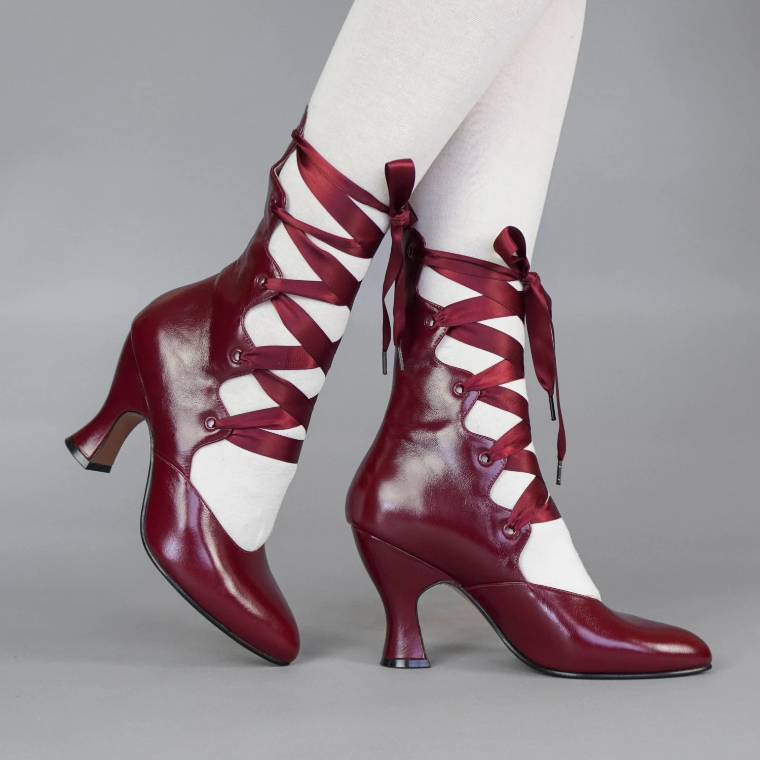Tango Edwardian Boots are just as seductive as the Tango dance craze that swept the world in the 1910s. Designed to show off the legs, these gorgeous lace-up boots are based on several antique examples from 1900 through 1920. Tango features a deliciously curved shaft and scalloped tabs, which are laced with double-faced satin ribbon laces. Tango comes with two sets of ribbon laces, for adjustable sizing. Smooth leather uppers are stunning in a variety of beautiful colors. Tango sports a brand-new, custom 3.5 inch/ 8.9 cm French heel- our highest heel yet! Tango’s heel is just as curvy and sumptuous as it is well-balanced, so you can dance the night away.