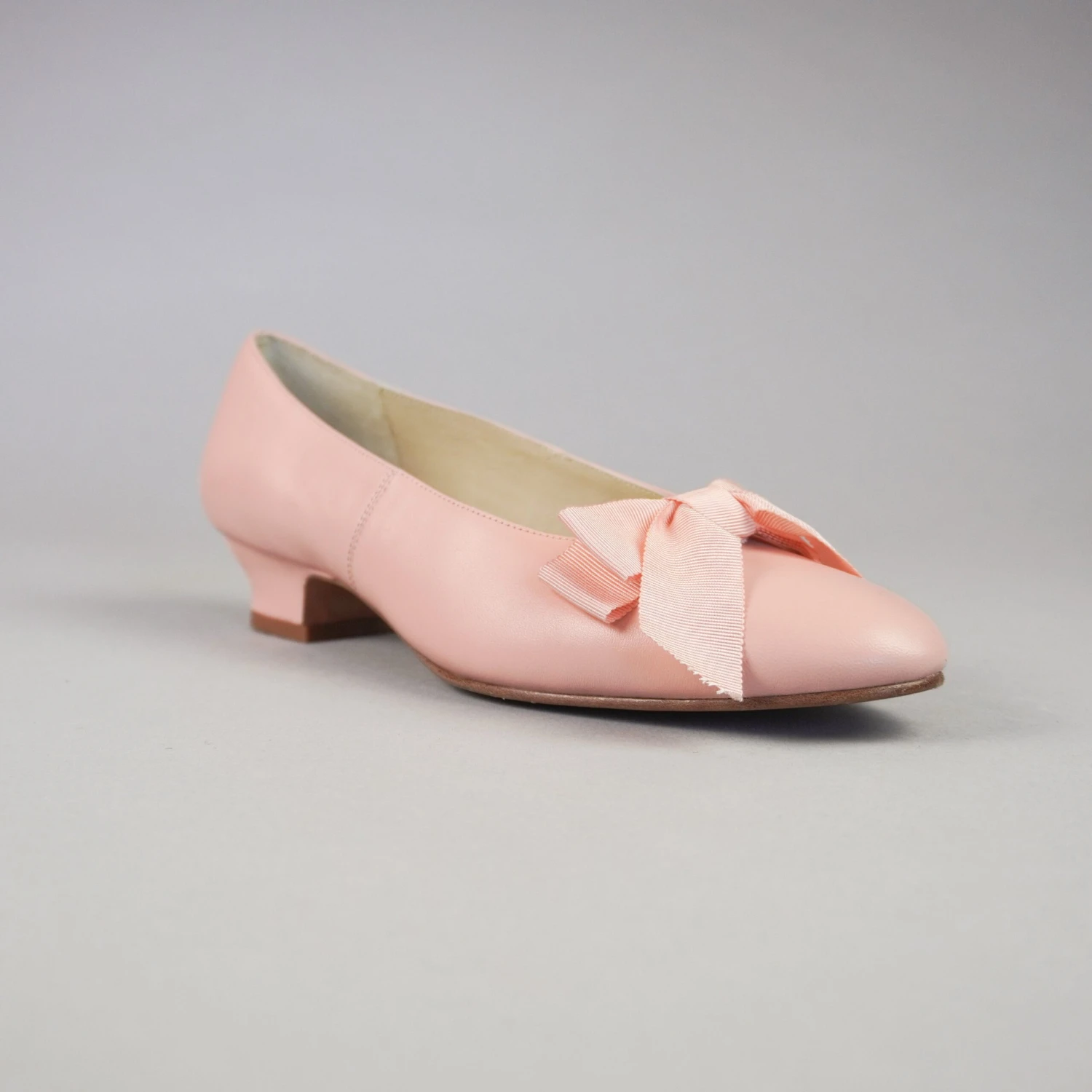 For those seeking the perfect low-heeled, Victorian/Edwardian slipper! Waltz Edwardian Slippers are a sleek, versatile, and luxurious leather slipper, perfect for waltzing, walking or wedding. Accurate to the 1870s to 1920, these splendid slippers will seamlessly sweep you from daytime events to the dance floor. Customizable with a removable double-bow Petersham ribbon shoe clip, Waltz’s almond-shaped toes look darling peeking out from your skirt hem. They also pair wonderfully with your contemporary wardrobe! Our brand-new custom 1.25″ / 3.1 cm French heel is perfectly balanced, and supremely soft pebbled leather uppers wrap around the foot for a comfortable fit. Like the antique slippers of the Edwardian era, Waltz has a soft toebox, for a close fit.
